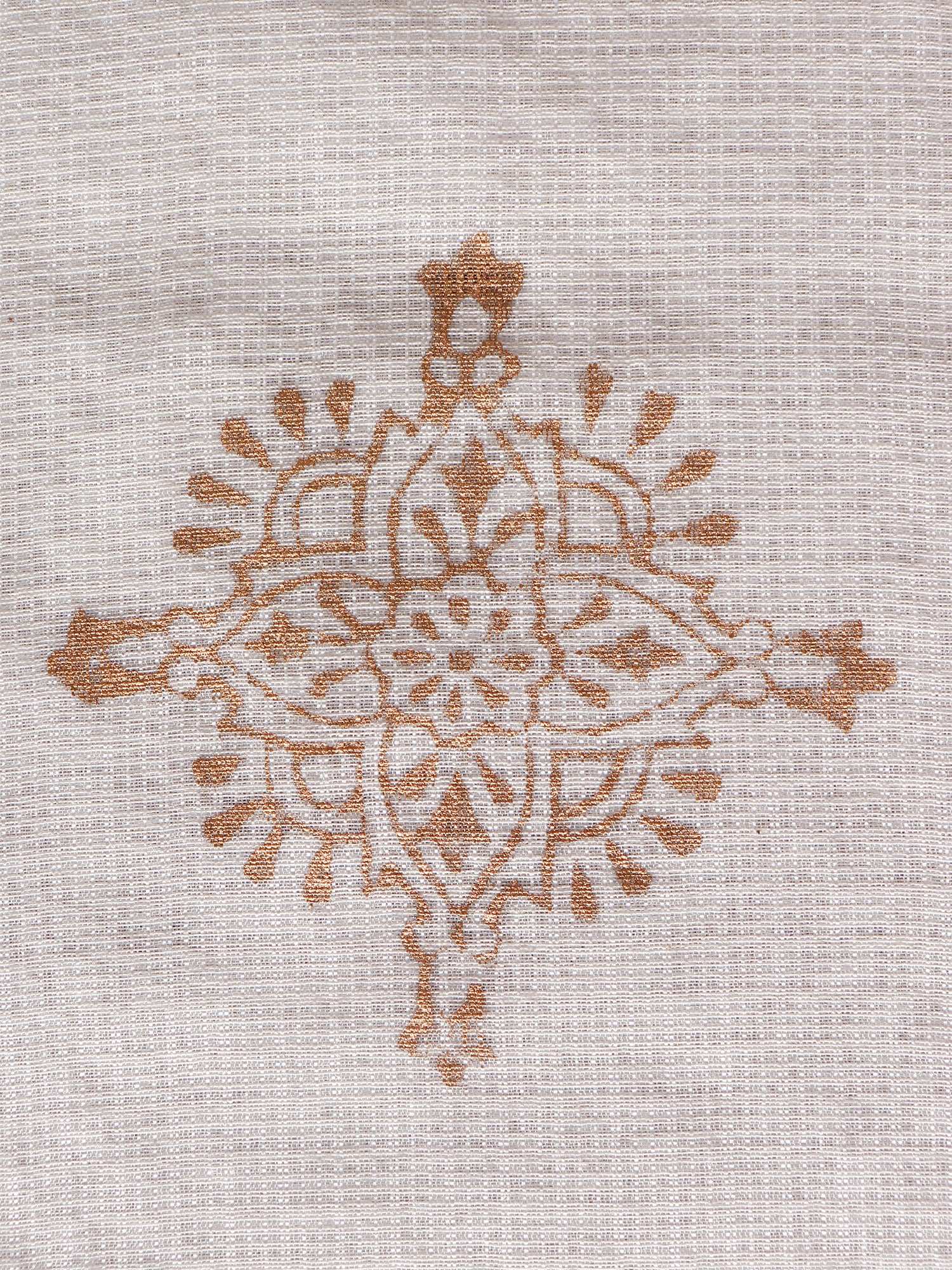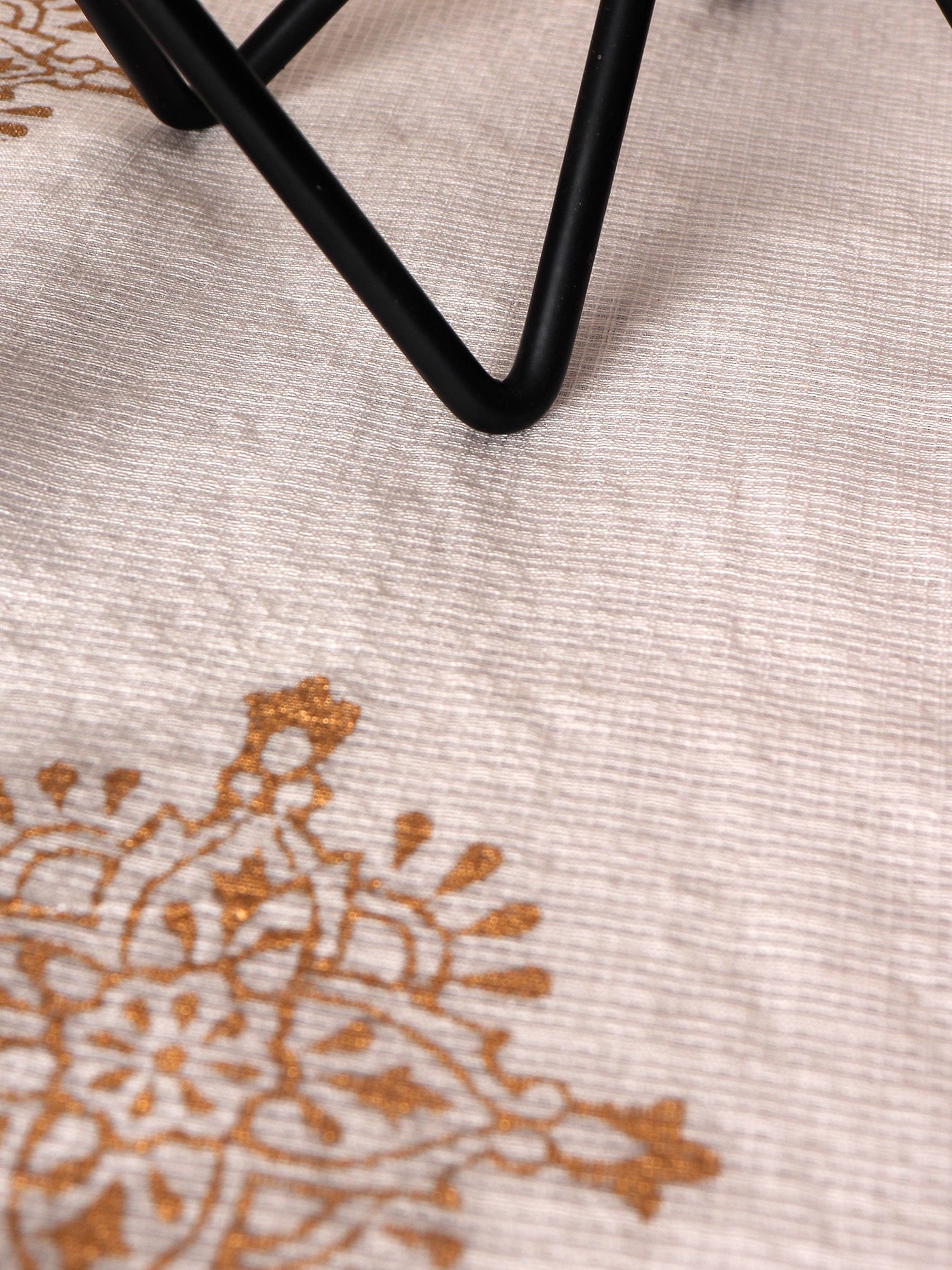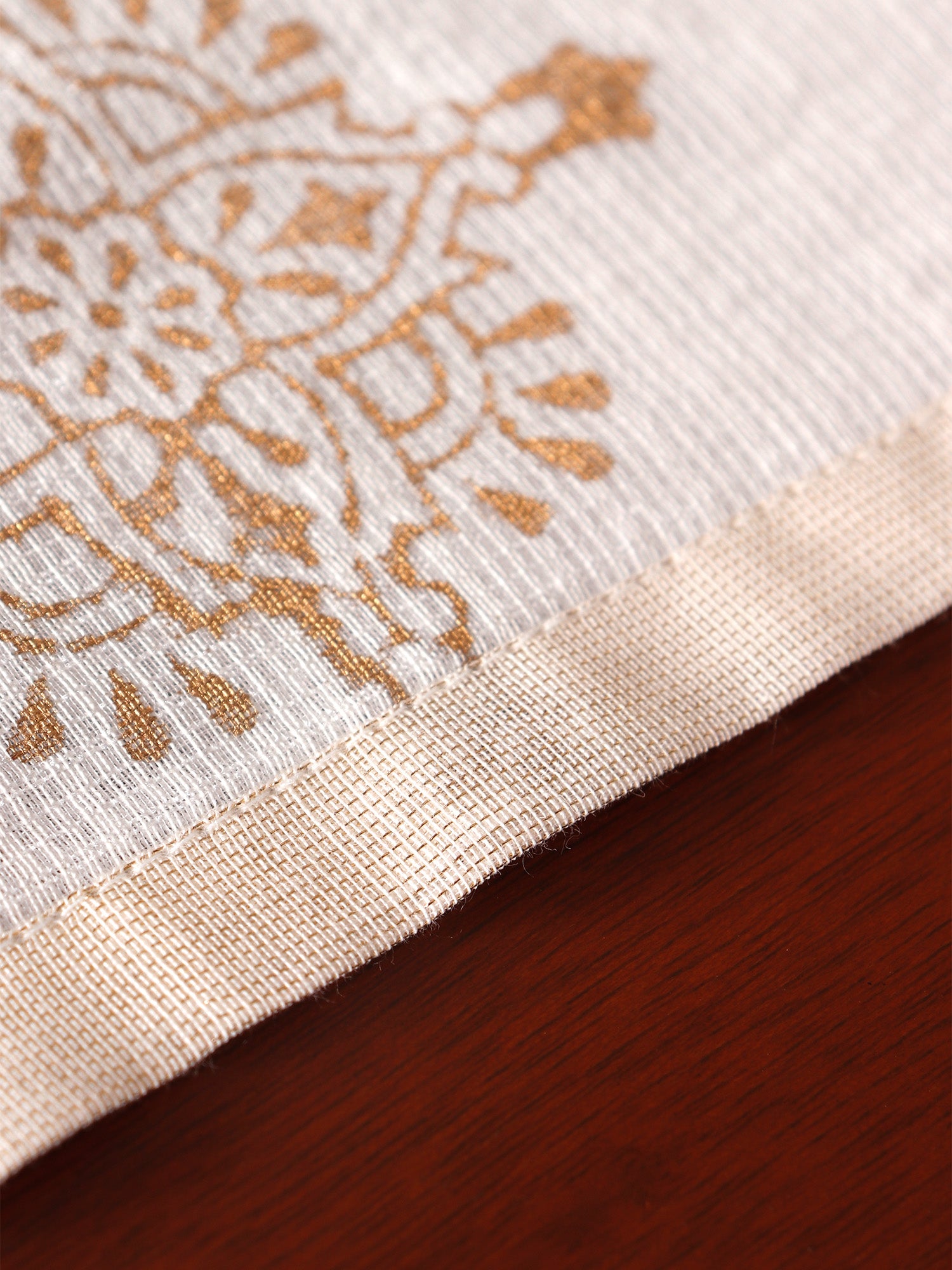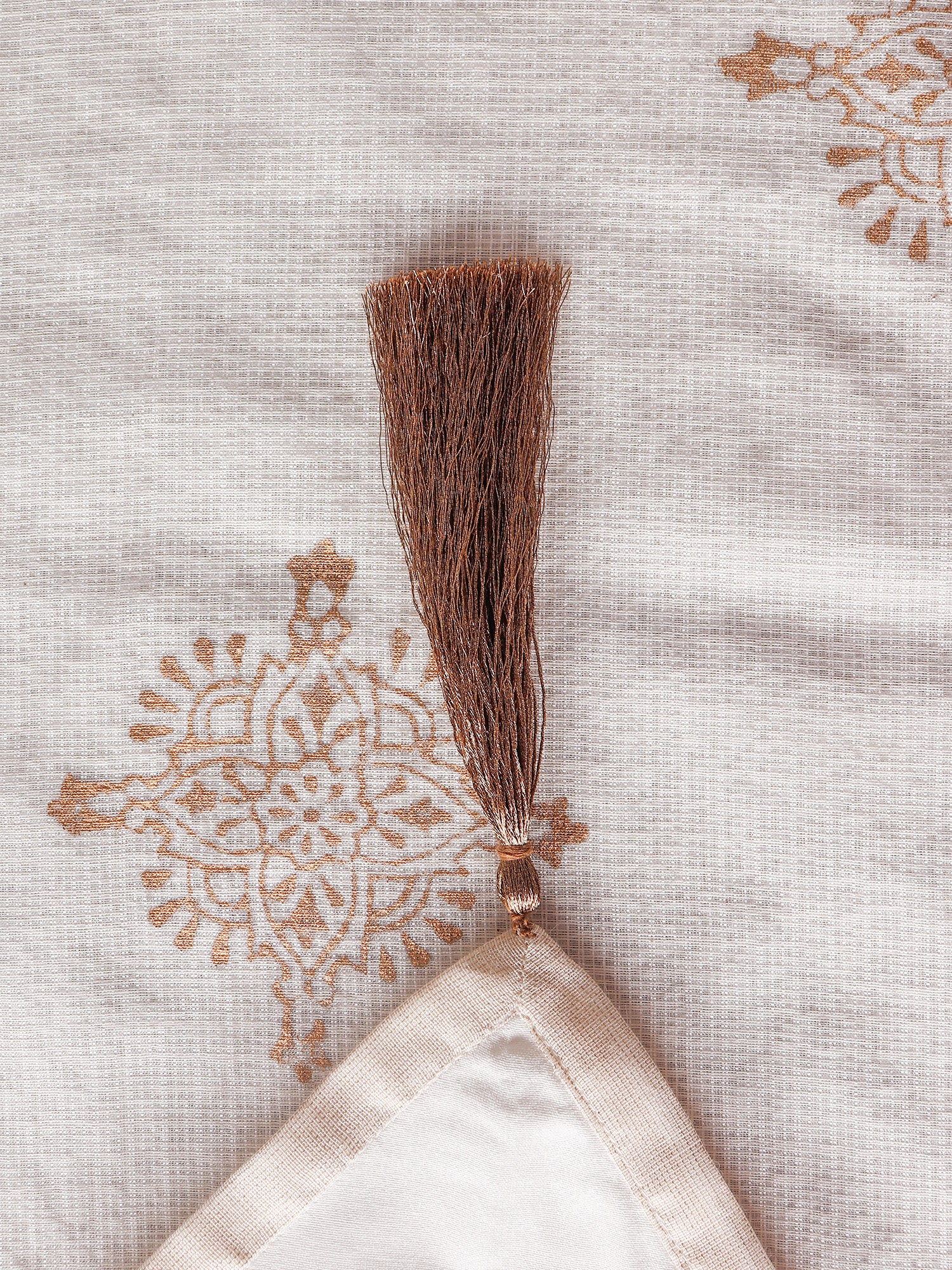 Brocade Silk Table Runner with Golden Block Print and Golden Tassles | Off White - 12in X 84in