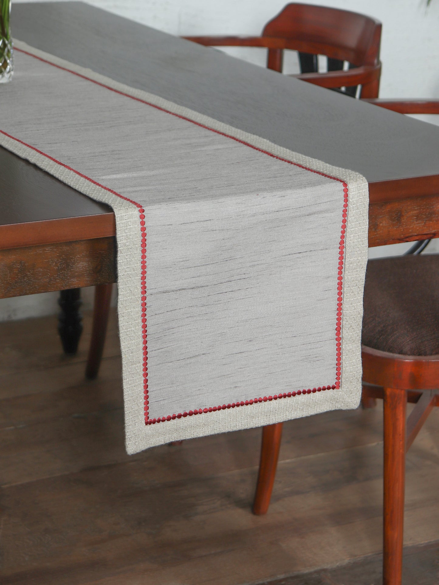Table Runner Cotton Blend with Dotted Embroidery & Flange Border | Grey 12in X 84in