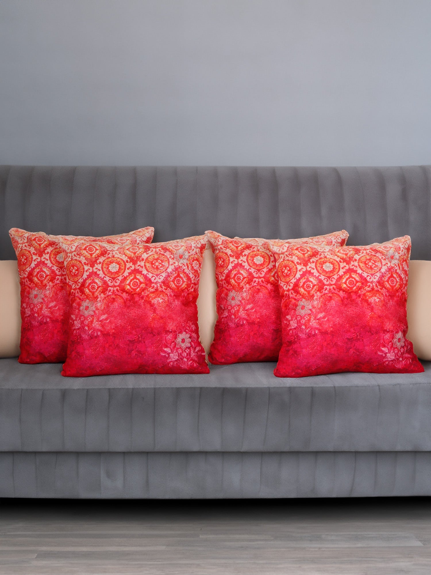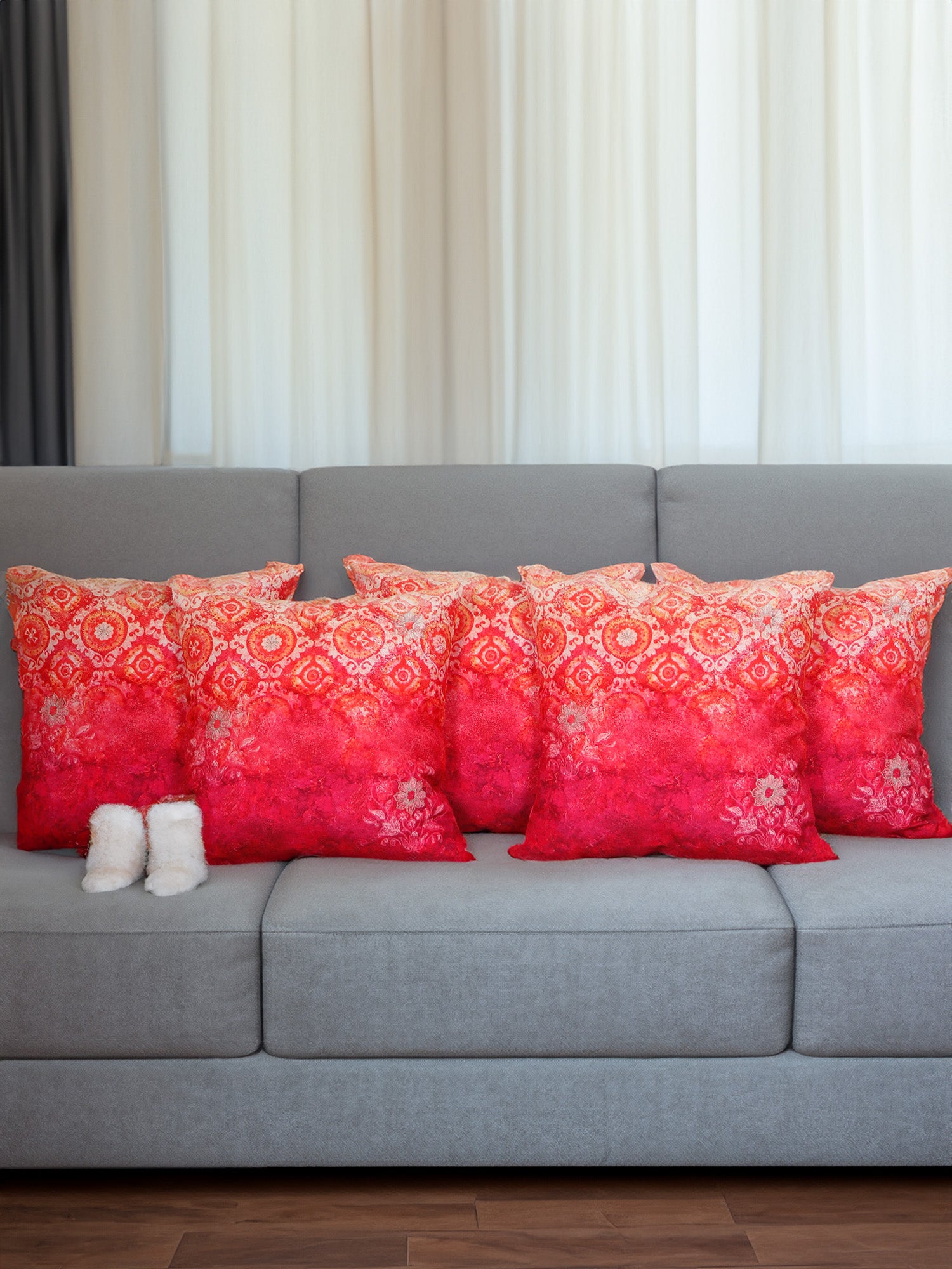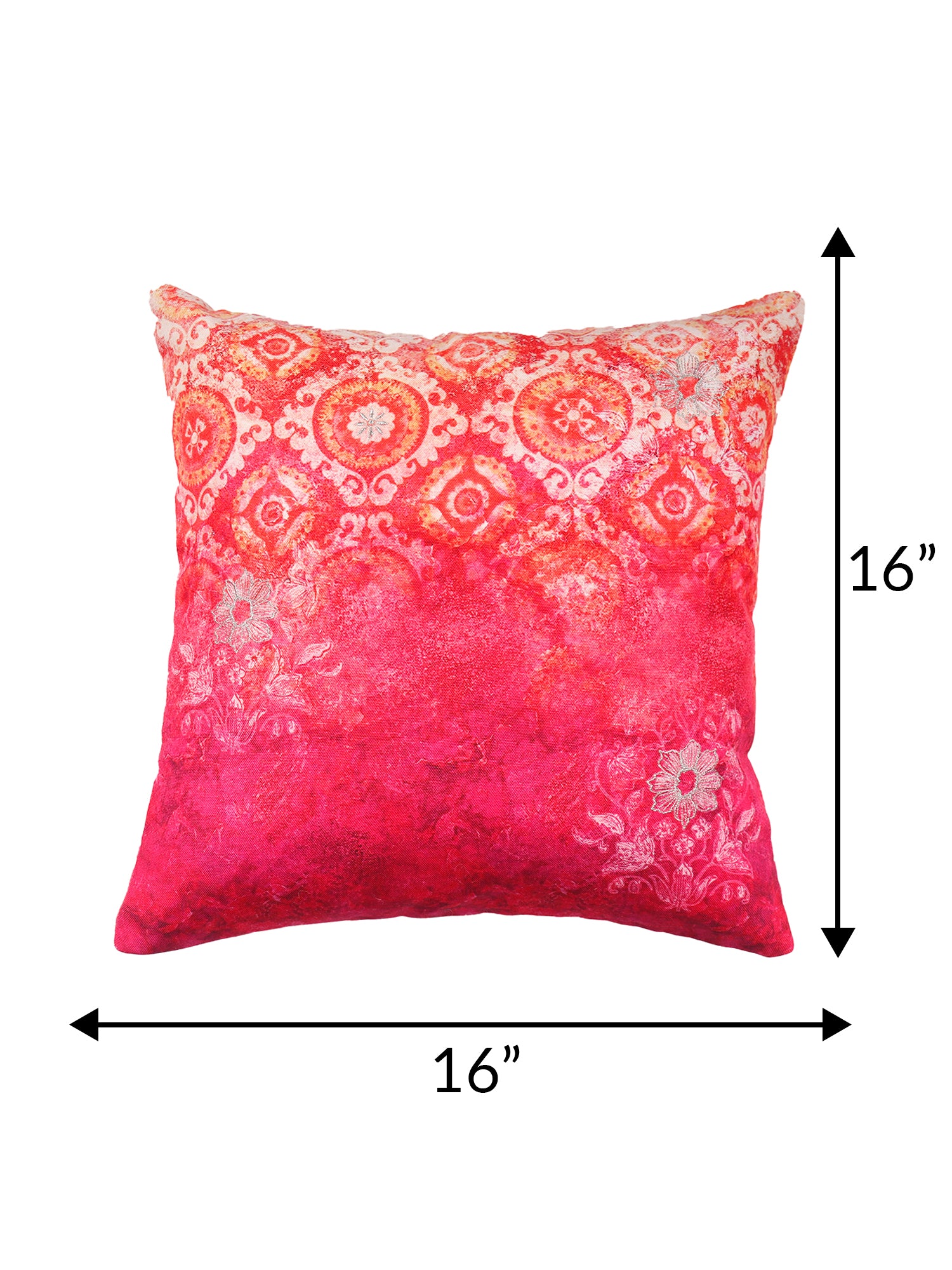 This 16x16 inch cushion cover, crafted from polyester blend fabric, comes in a soft pink hue and features a striking digital print with silver zari detailing. Its elegant design adds a touch of shimmer and sophistication to any room, making it a perfect accent piece for modern interiors.
