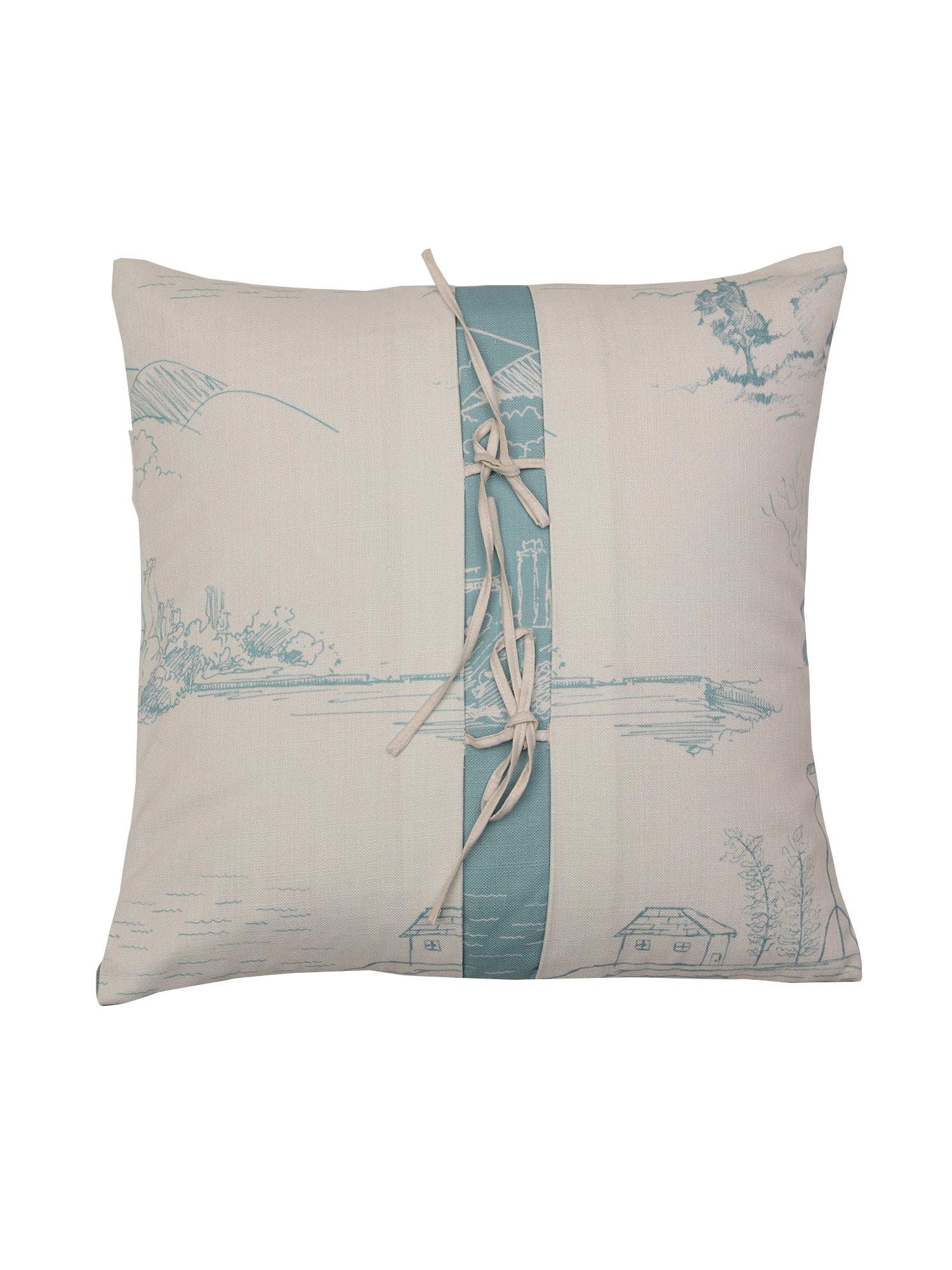 Bring a charming, handcrafted touch to your space with this scenic printed cushion cover designed in soothing beige and blue tones. The cover features a delicate landscape-inspired print complemented by a vertical fabric panel at the center, finished with decorative tie-up bows for an artisanal look. Made from soft, durable fabric, it adds both comfort and style to sofas, chairs, or bedding. The size of the cushion cover is 16 inches x 16 inches, set of 1. The zip closure at the back ensures easy insert and removal.