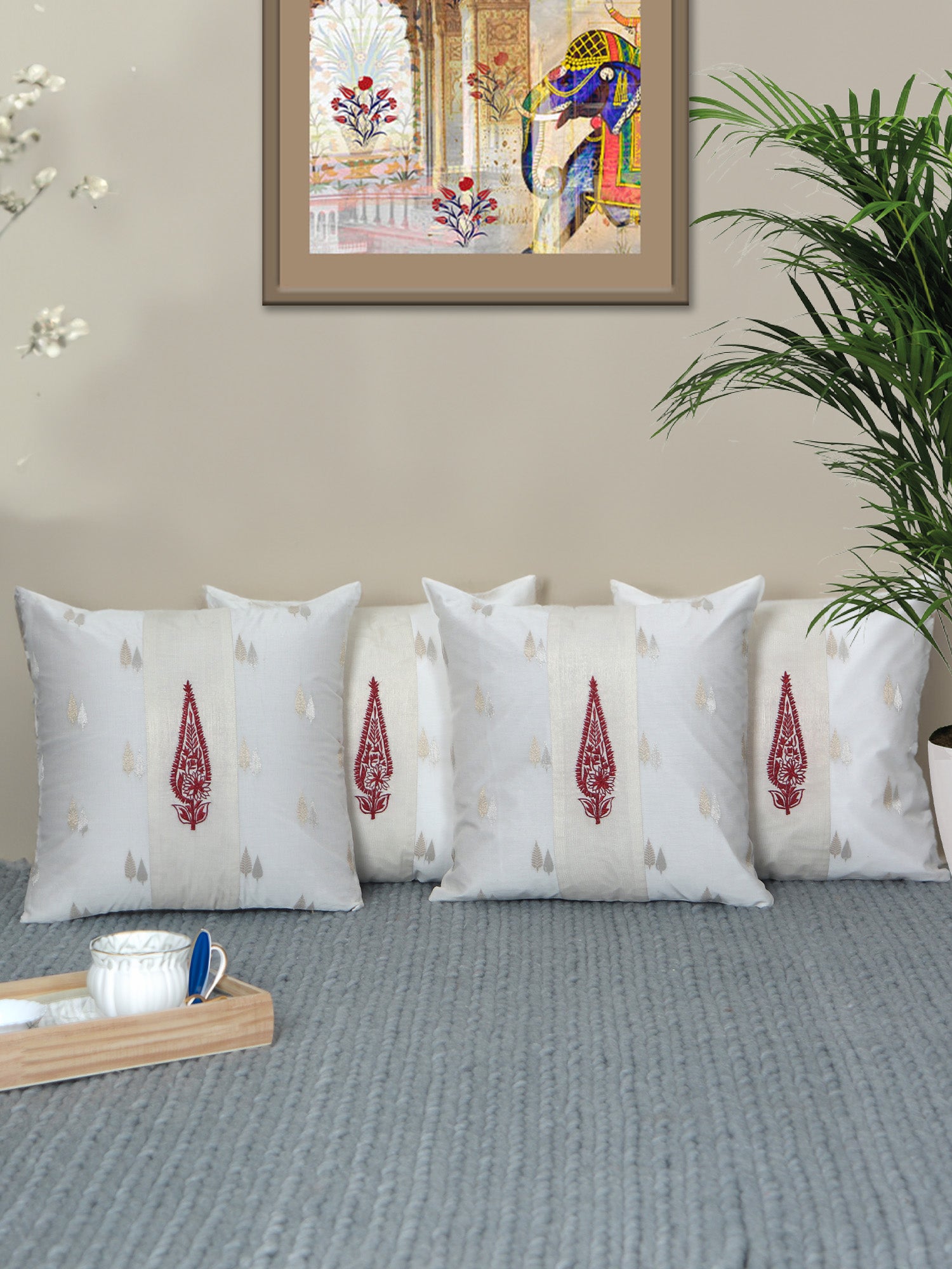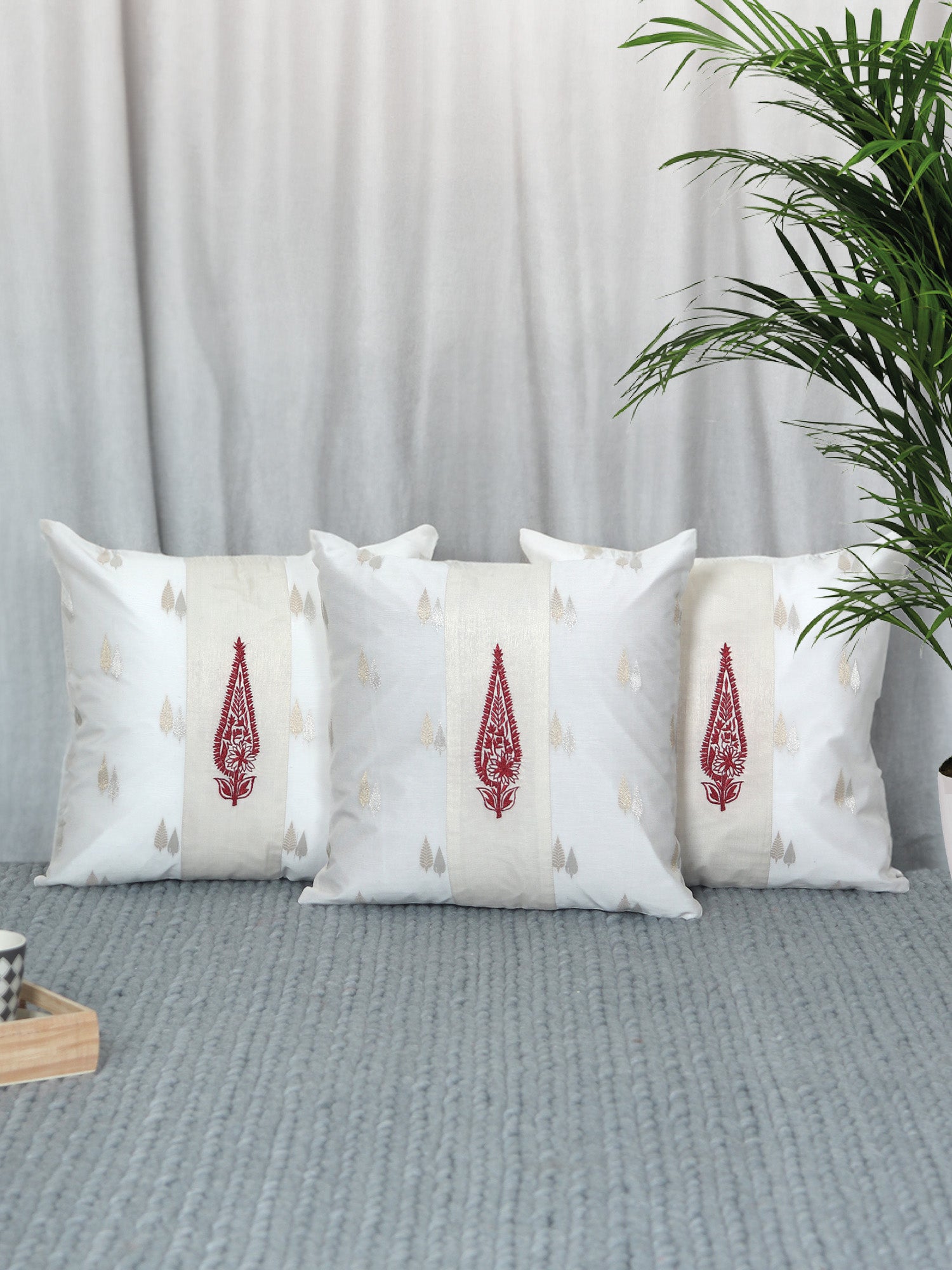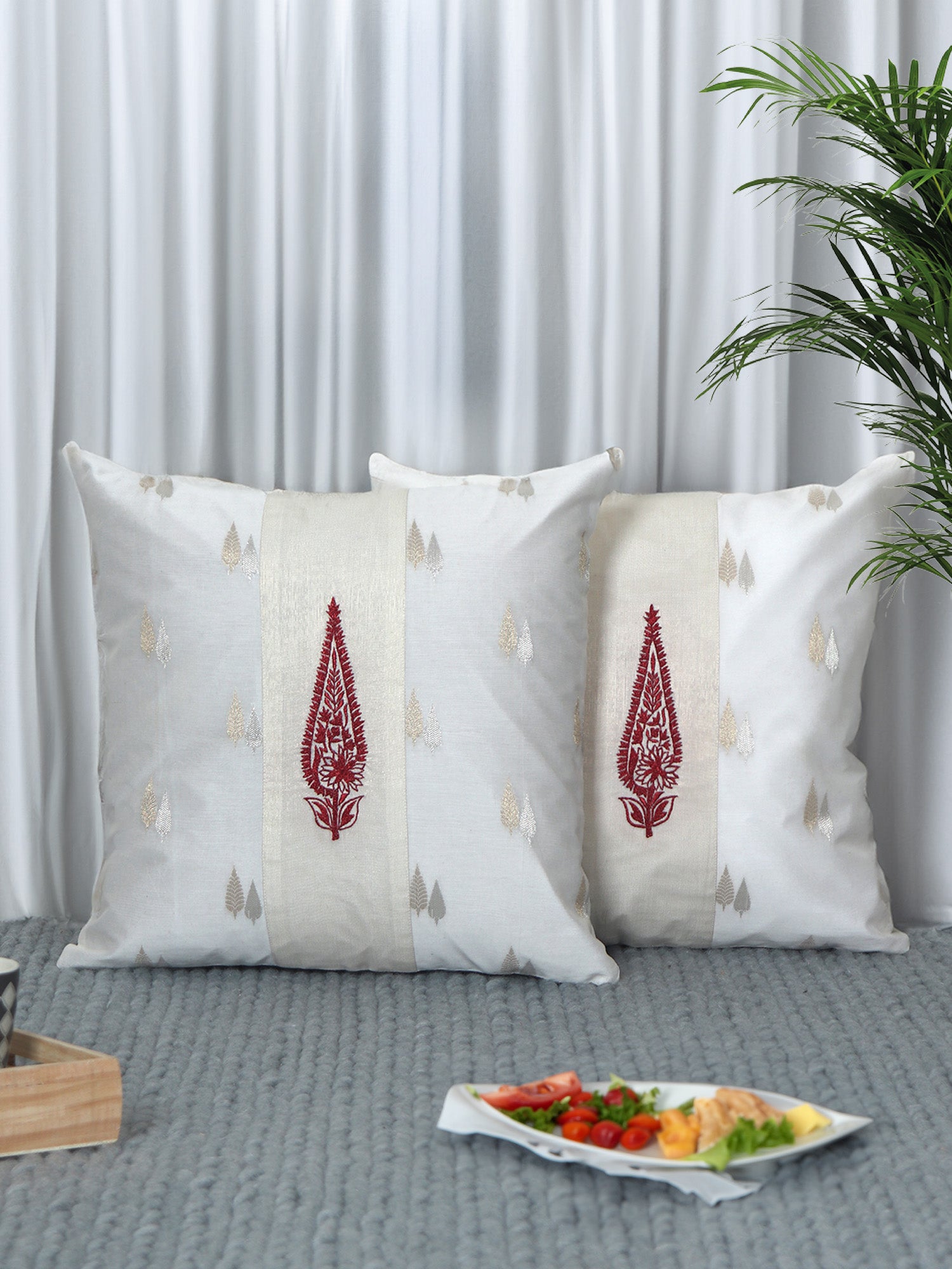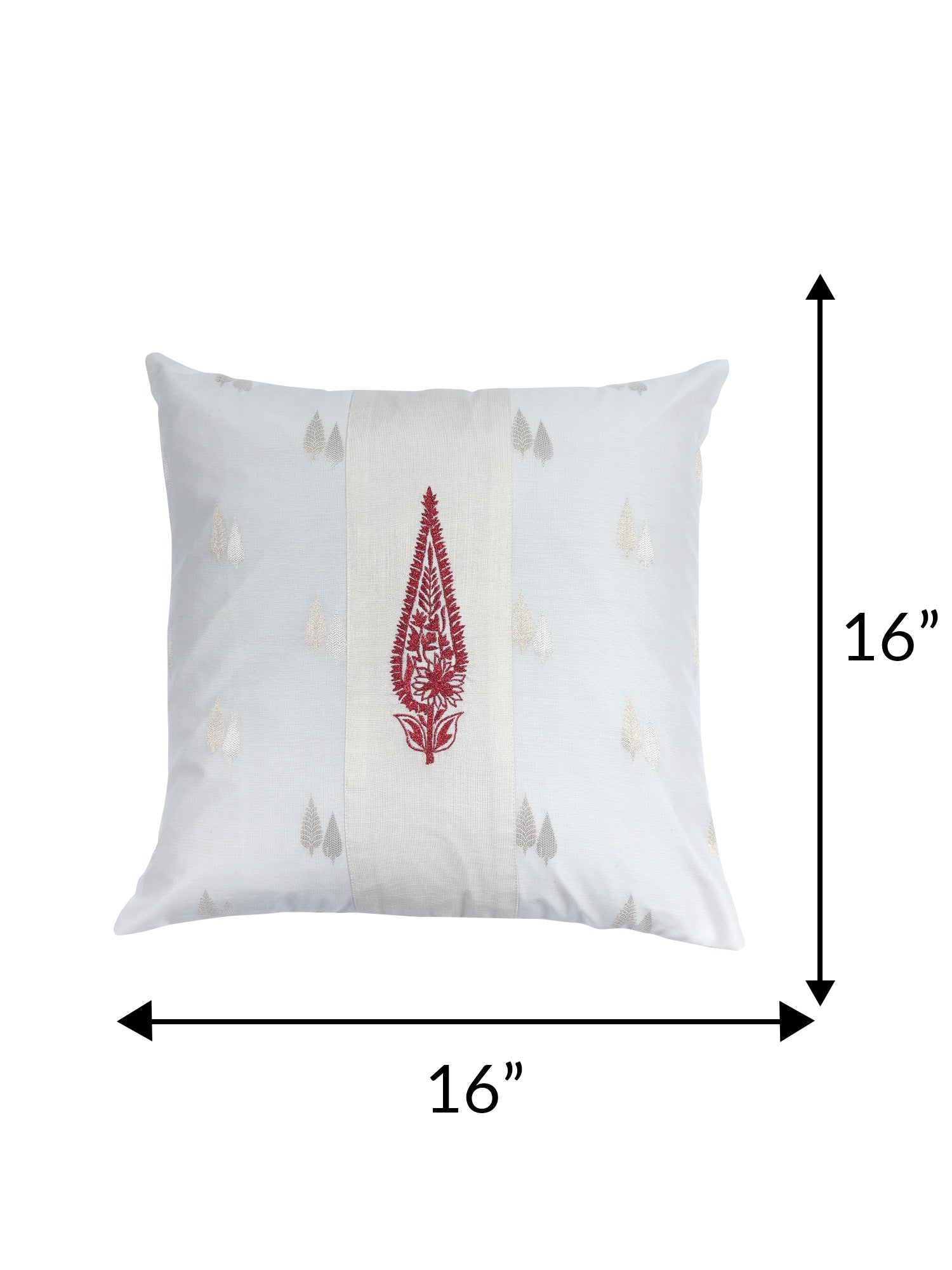 Brocade Silk Cushion Cover with Motif Embroidered - White