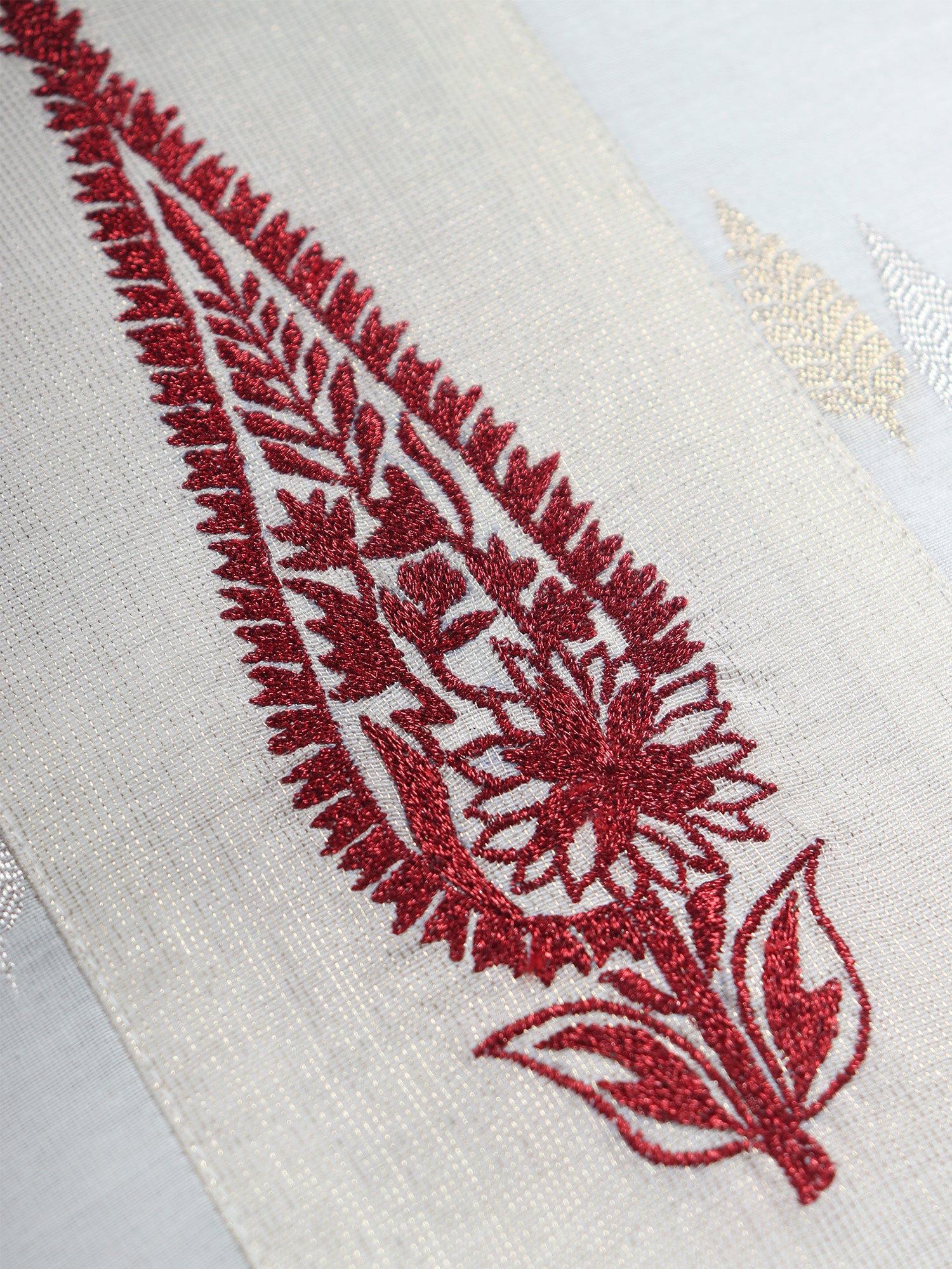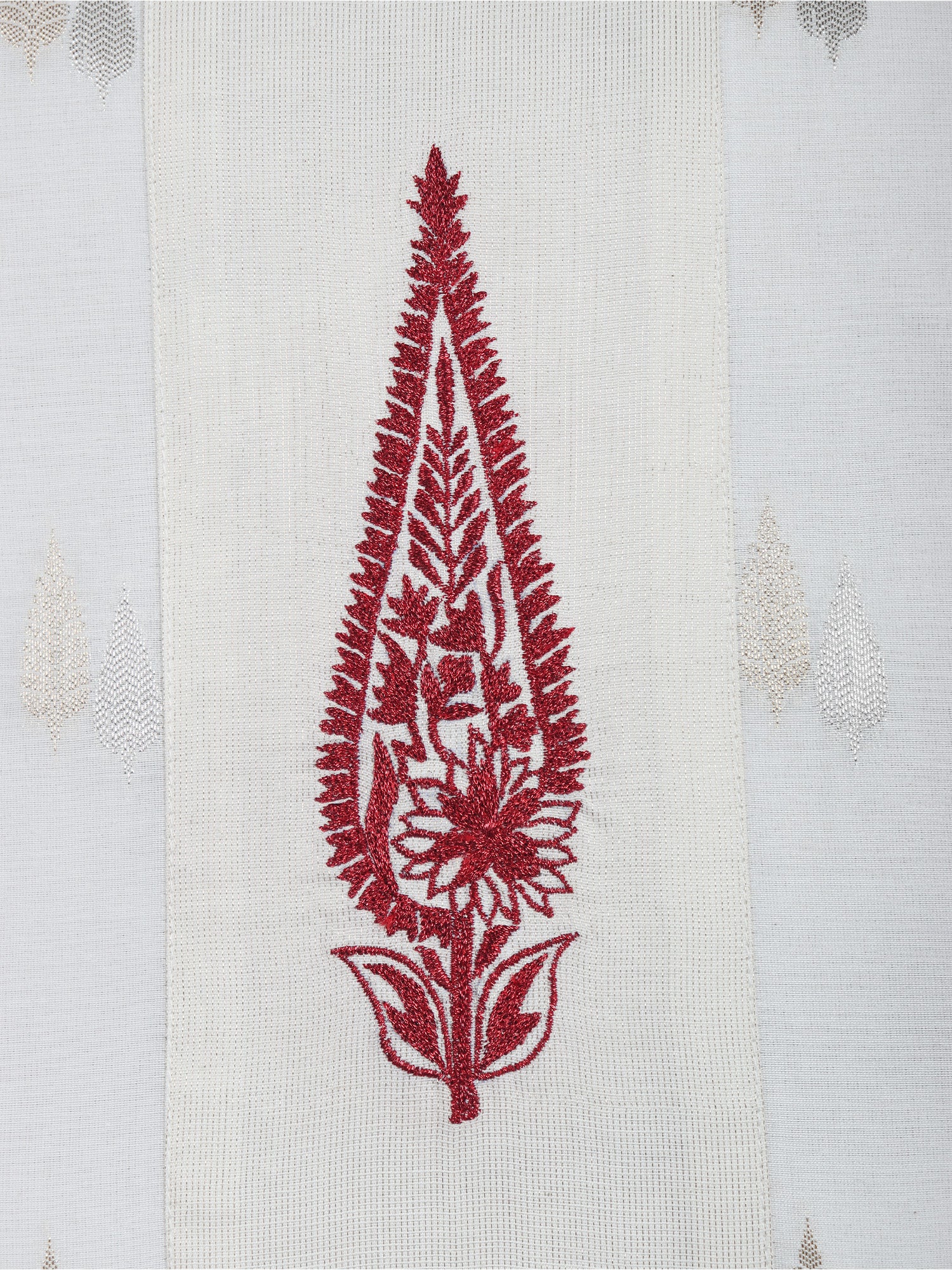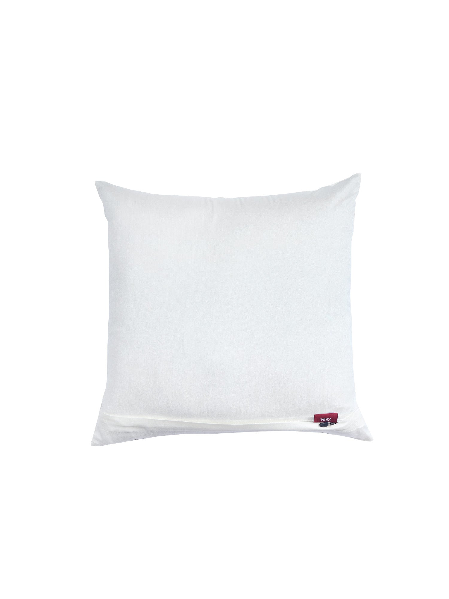 Make a statement with Zeba's off-white cushion cover! This 16x16 inch masterpiece features intricate brocade patchwork and bold red zari embroidery, centered around an ethnic motif. Infuse your home with a unique blend of luxury and cultural heritage.
