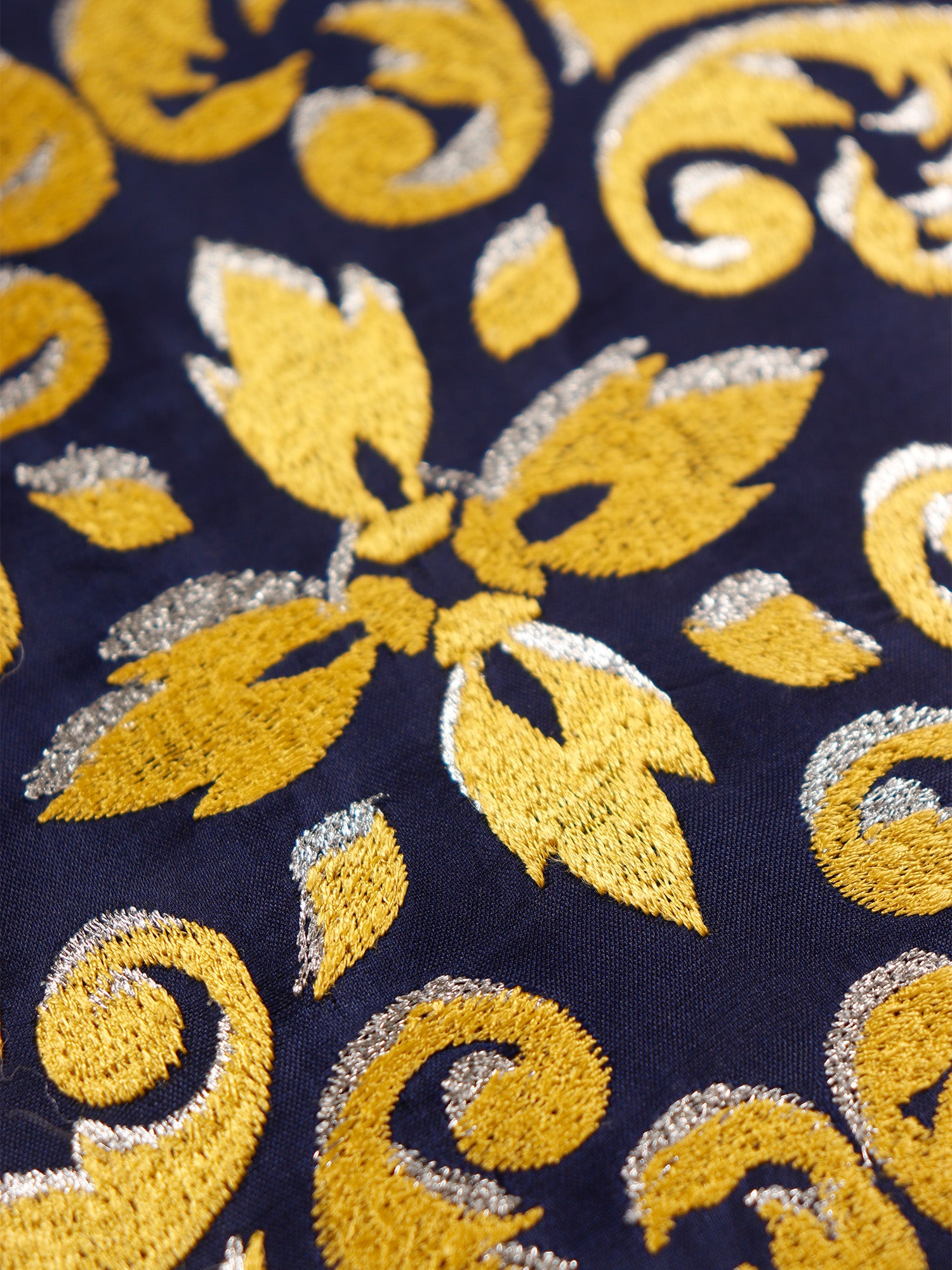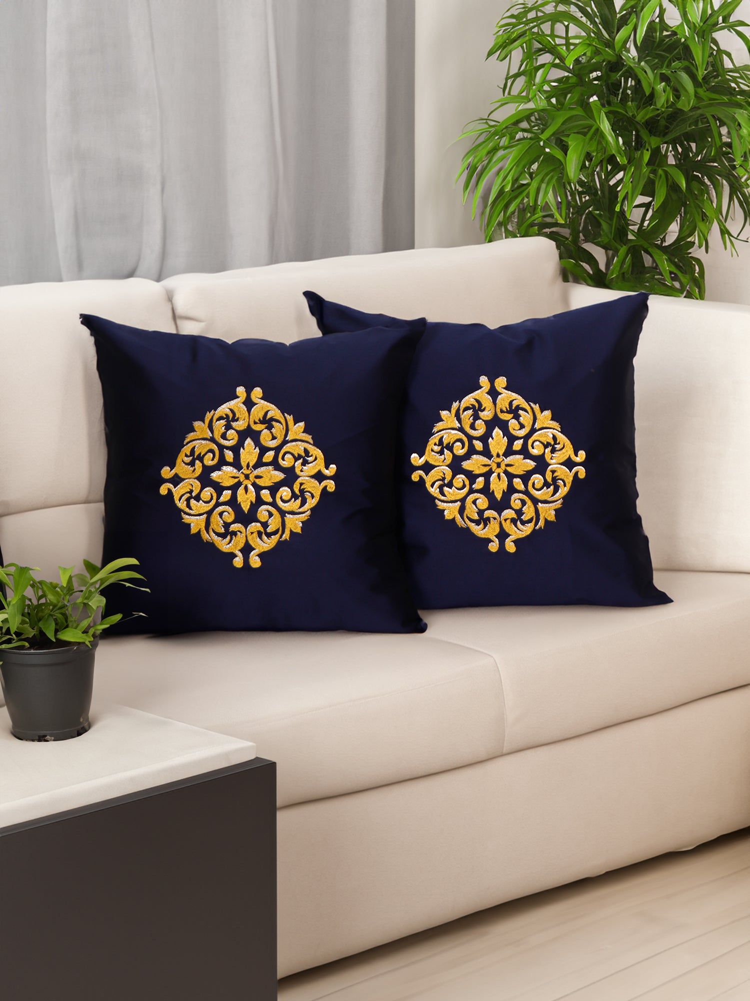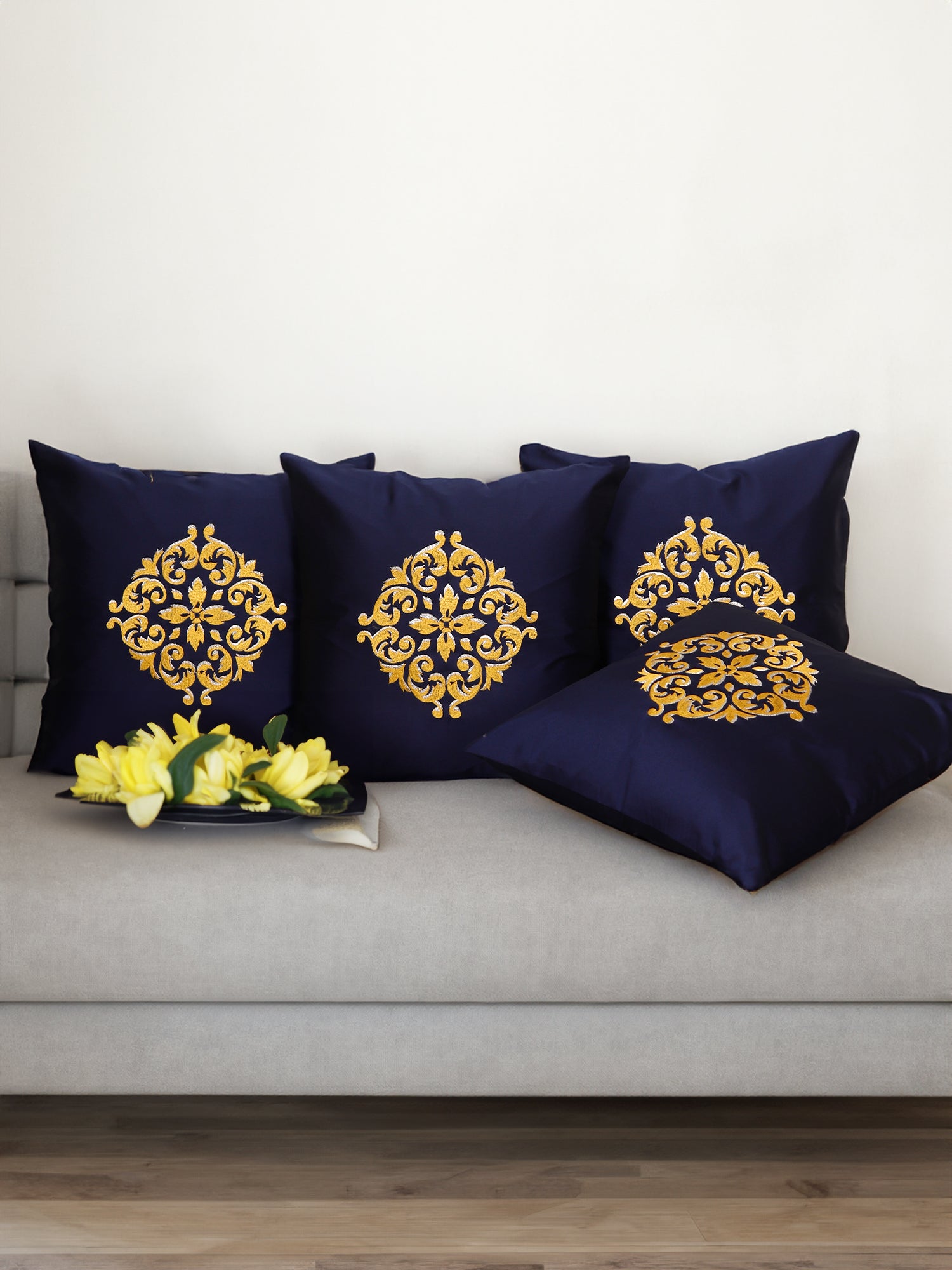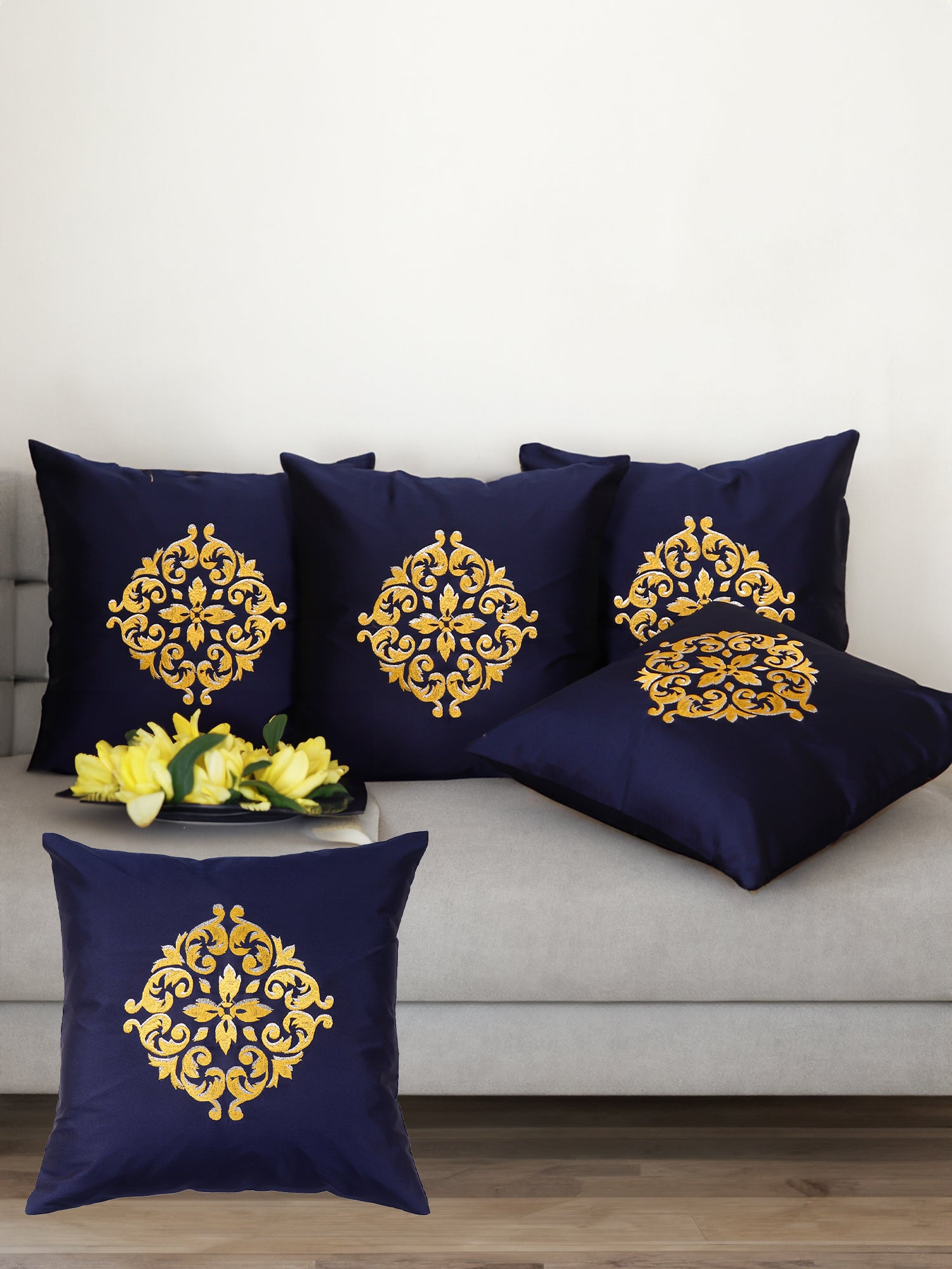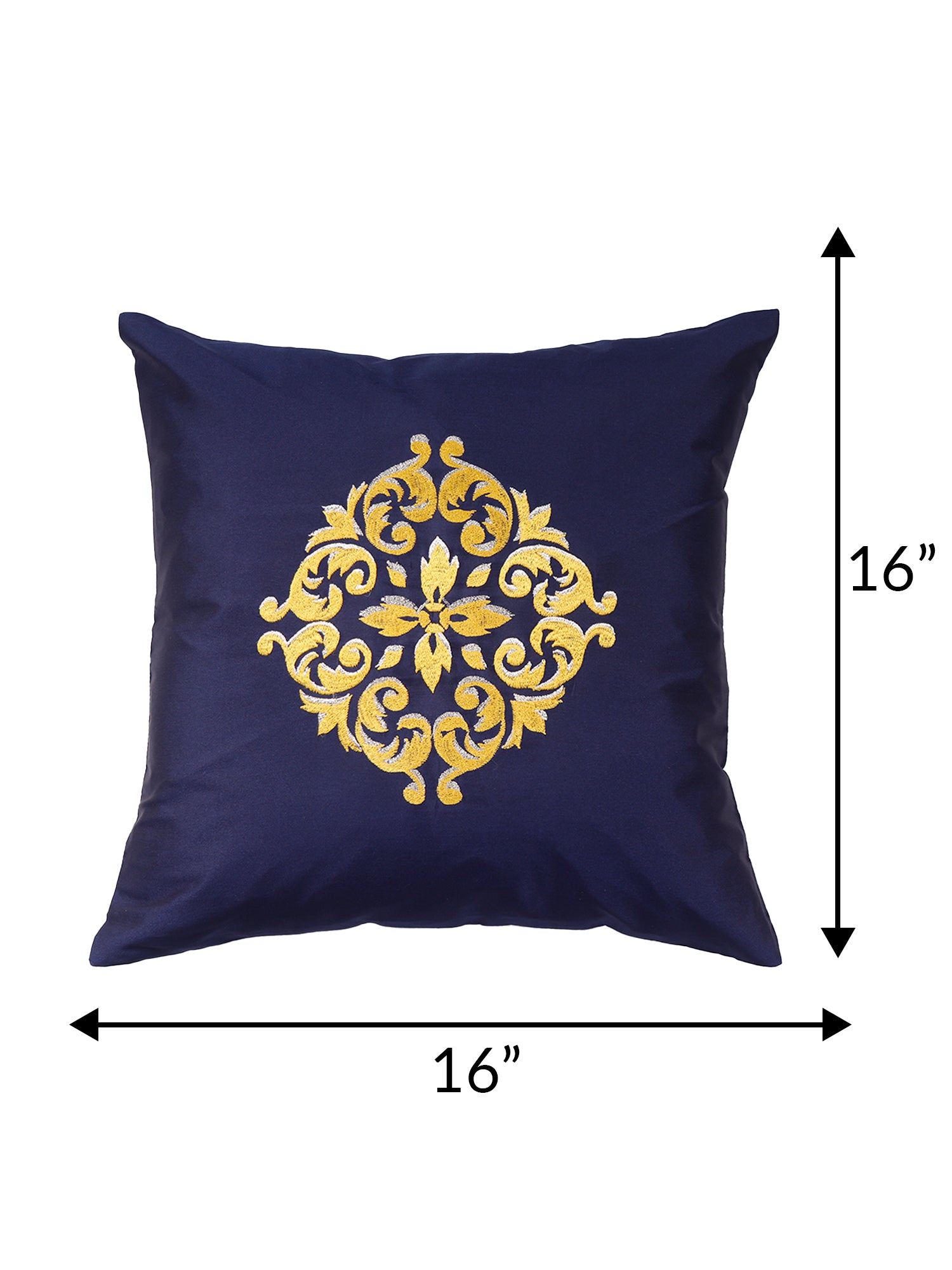 This 16x16 inch cushion cover, made from durable polyester, features a navy blue base with intricate two-tone machine embroidery. Stylish and versatile, it adds a touch of elegance to any space and is easy to care for with its machine-washable design.