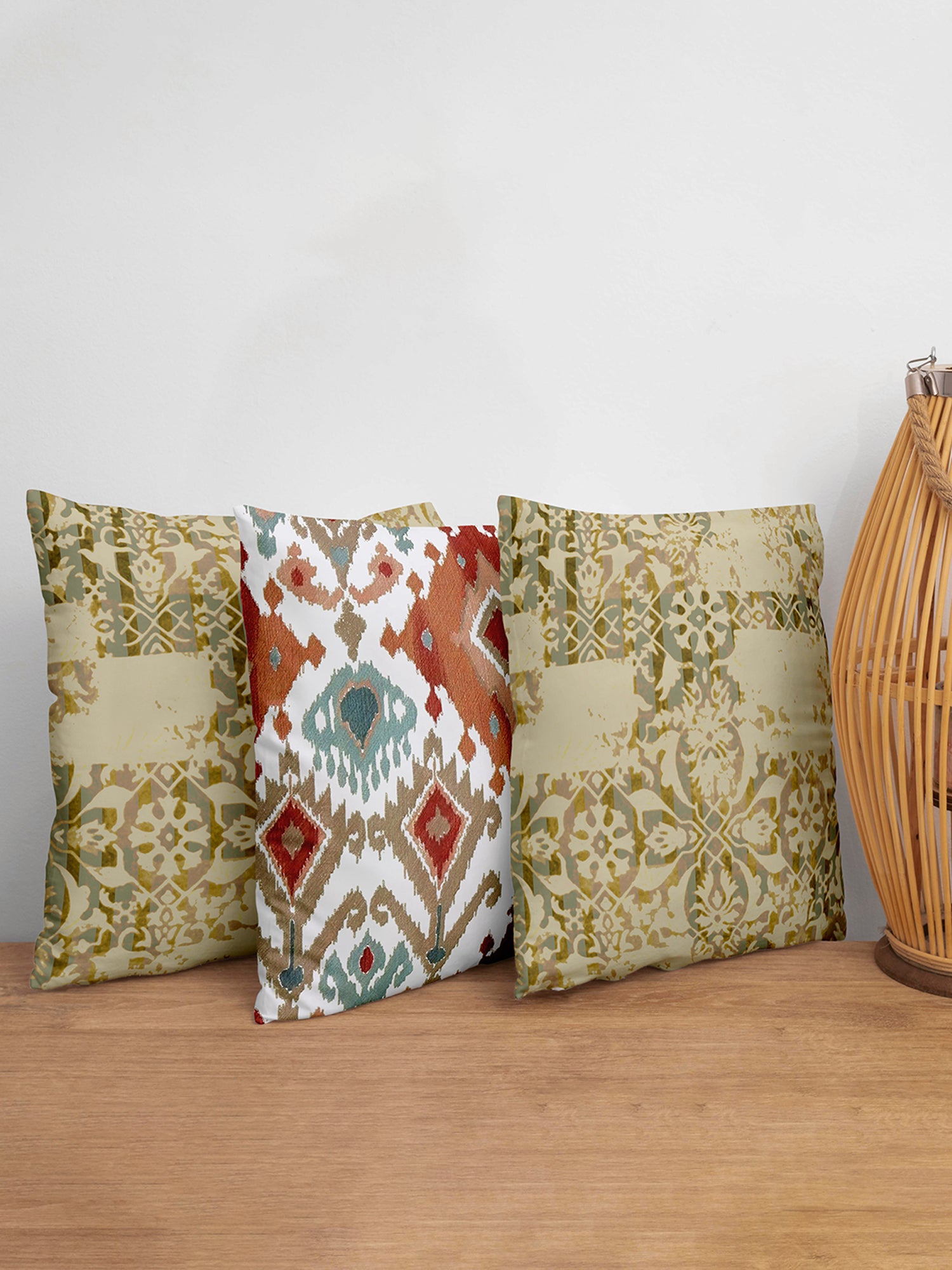 Cushion Covers Set Of 3 Polycanvas Printed Abstract Ikat Pattern Multicolor- 16" X 16"