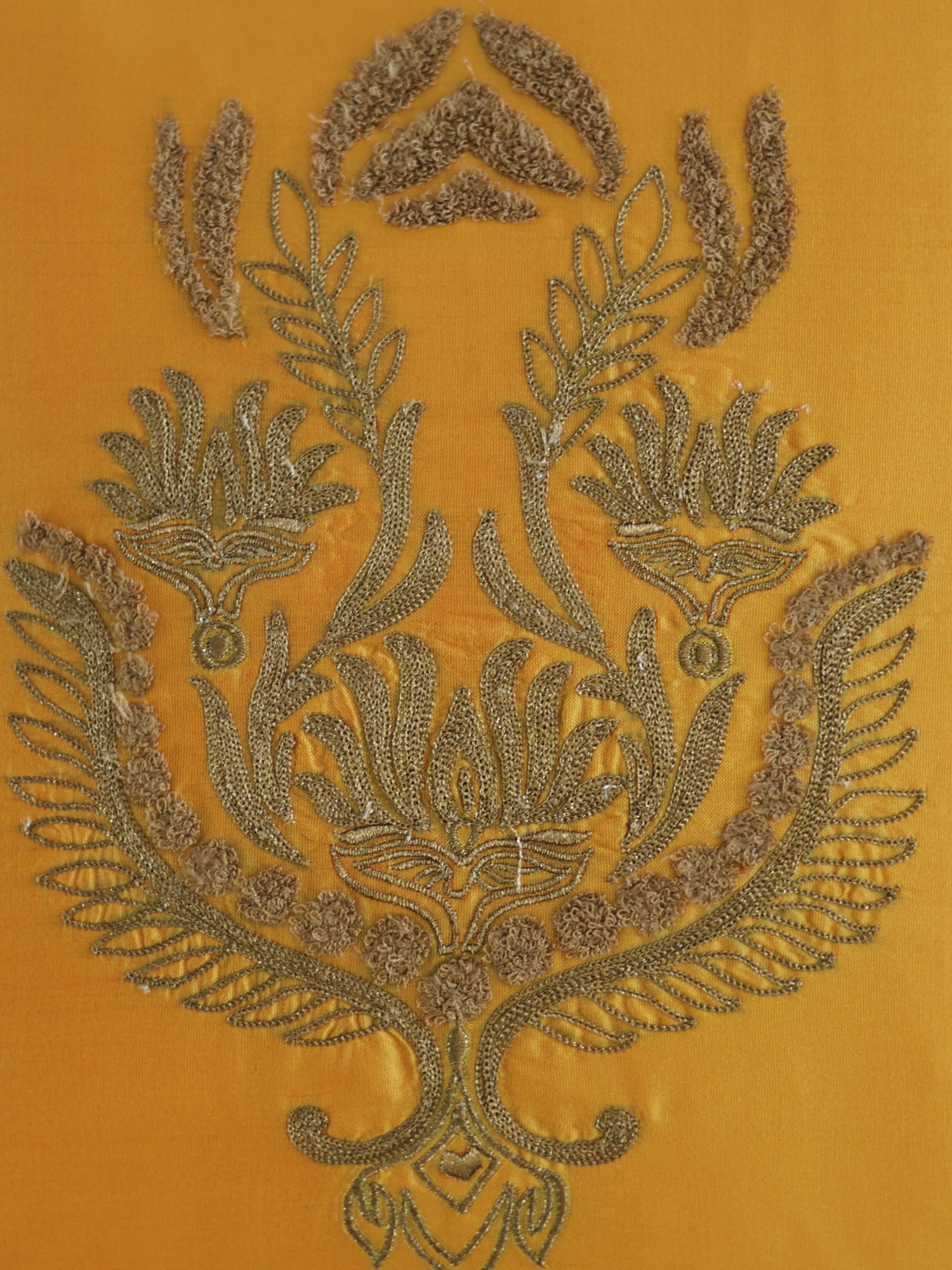 This Yellow Cushion Cover features both Aari and machine embroidery techniques to create a visually rich, textured design. The centerpiece is a majestic paisley and floral-inspired motif in subtle gold and beige tones, beautifully highlighted against the soft yellow base. The towel embroidery in between gives a texture and look to cushion cover. The size of this cushion cover is | 16x16inch | set of 1 and is made from a soft yet durable polyester. The zip closure at the back ensures easy insert and removal. A perfect piece to elevate your decor this festive season.