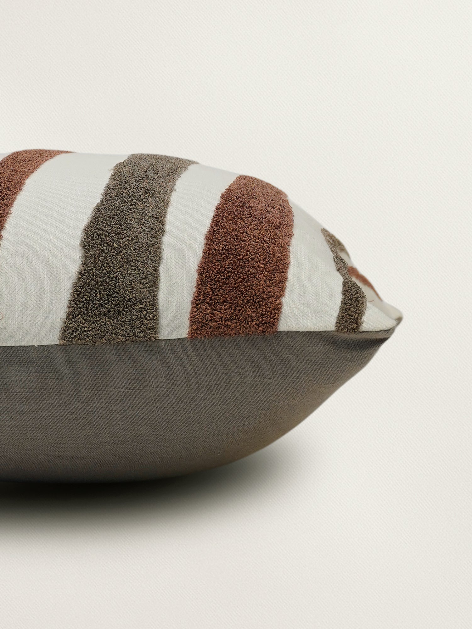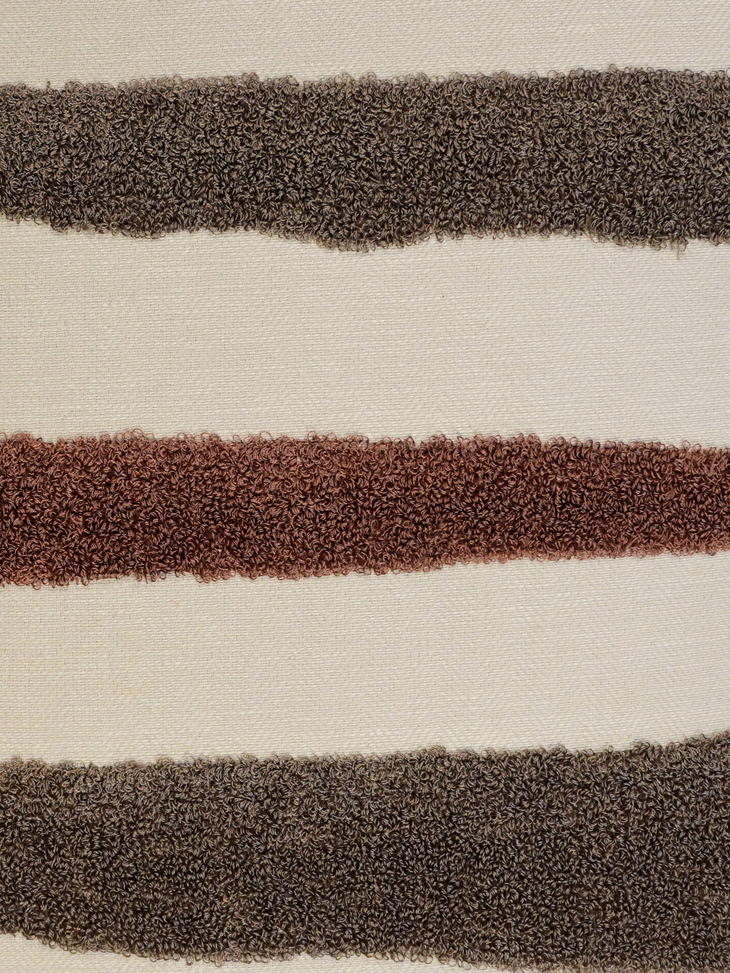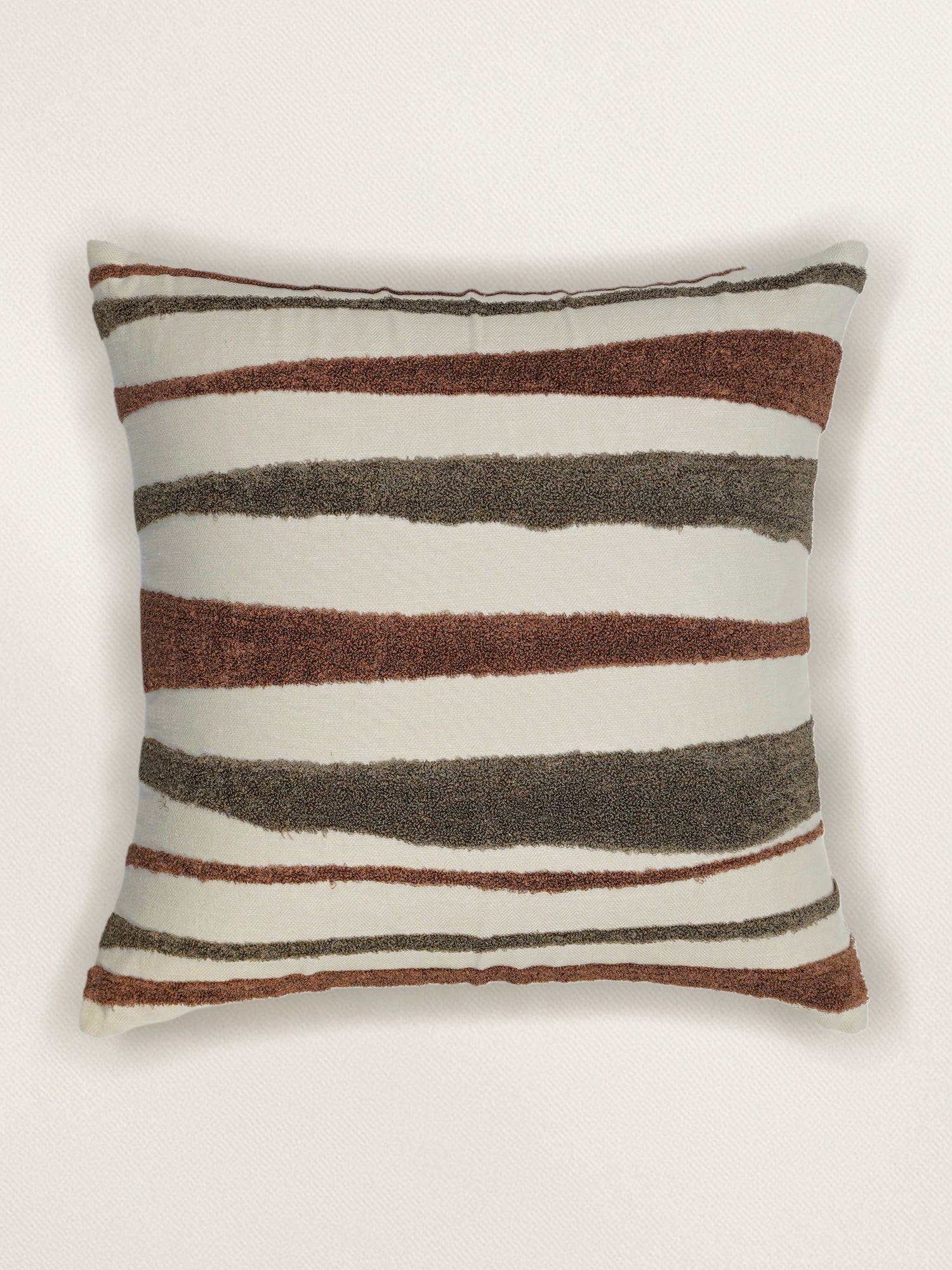 This 18 x 18 inch cushion cover, crafted from a soft and durable cotton blend, features a modern towel-style embroidered design with irregular horizontal stripes that add texture and depth. The earthy color palette of warm browns, muted olive, and beige on a beige background creates a cozy, natural look that complements both contemporary and rustic interiors. Perfect for adding a touch of warmth and sophistication to your sofa, bed, or reading nook.