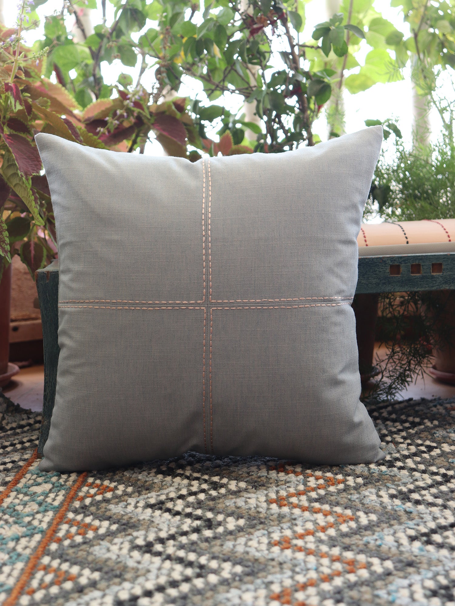 Hand Stitched Cross in Center | Embroidered Grey Cushion Cover 16 Inch x 16 Inch