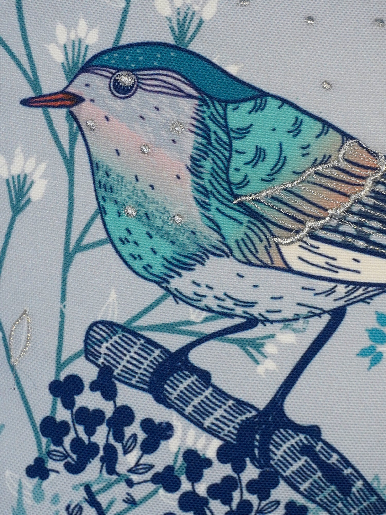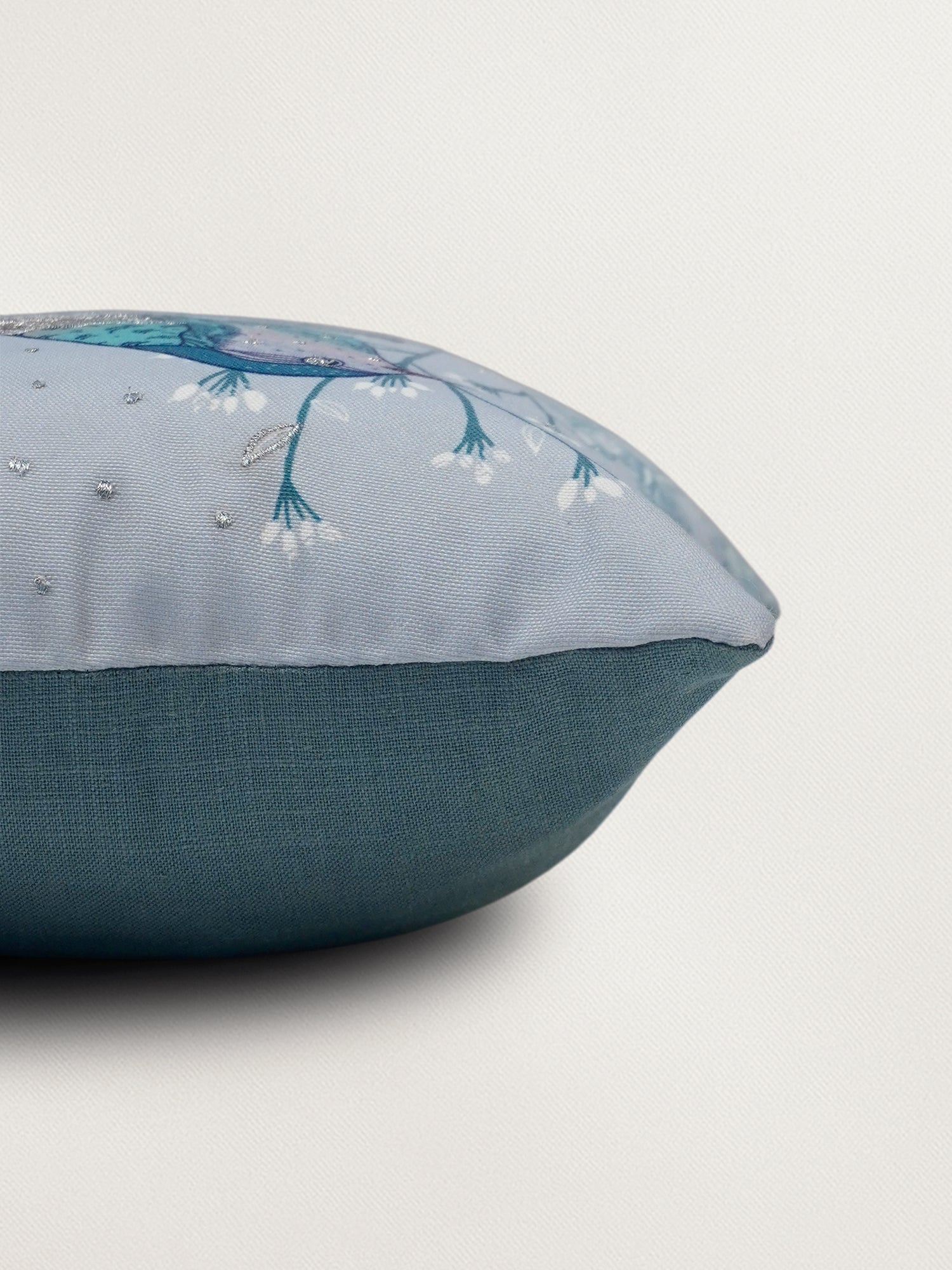 This charming 12 inch x 12 inch cushion is crafted from durable polycanvas fabric and features a stunning combination of digital print and embroidery. The design showcases a beautifully illustrated bird on a branch surrounded by floral motifs. Set against a soothing sky-blue background, the color palette includes shades of teal, navy, and soft lilac, enhanced with fine silver thread accents that add a gentle shimmer. Perfect for adding a refreshing, nature-inspired touch to your décor,