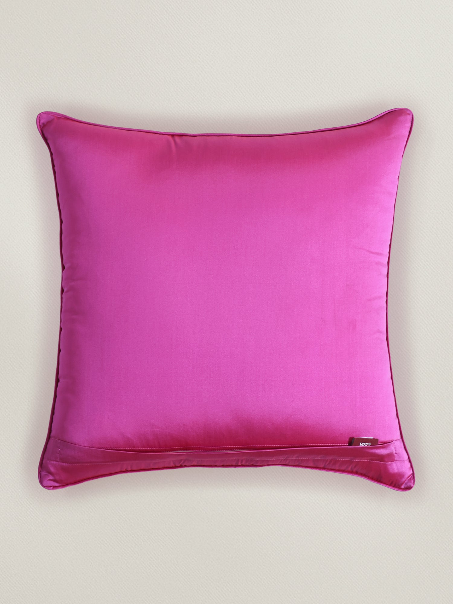 This Phulkari Diwali collection features Taffeta Cushion Cover in a vibrant patchwork design in pink and yellow, highlighting the intricate machine embroidered work. Crafted from smooth and glossy taffeta fabric, 16x16inch is the standard cushion cover size. The embroidered texture and vibrant colors make it a standout accent for both modern and traditional interiors. Perfect designer cushion cover for this festive season.