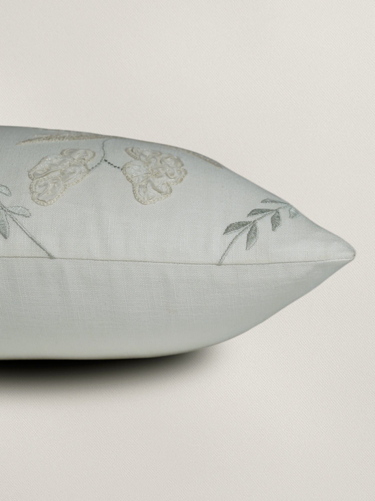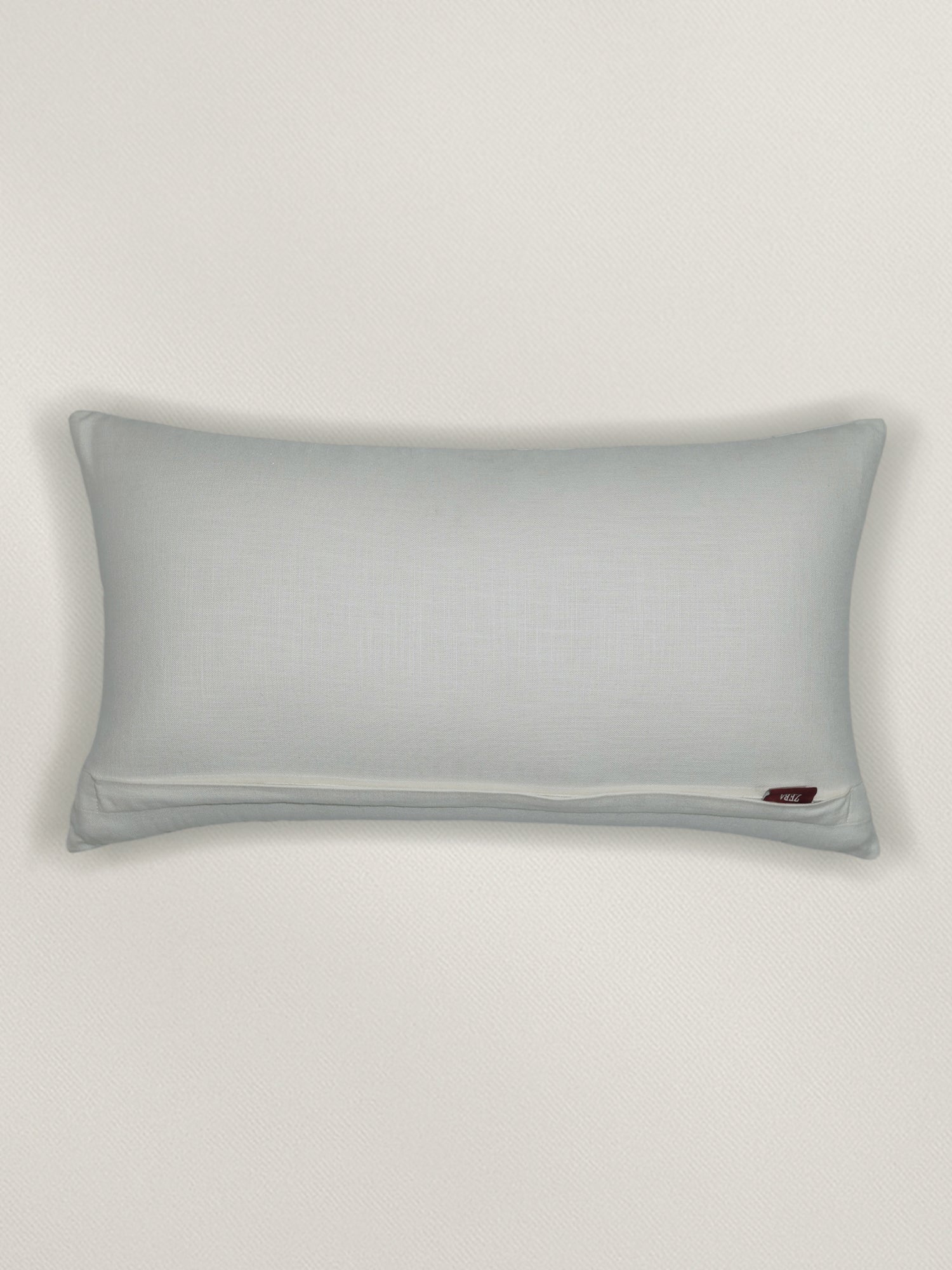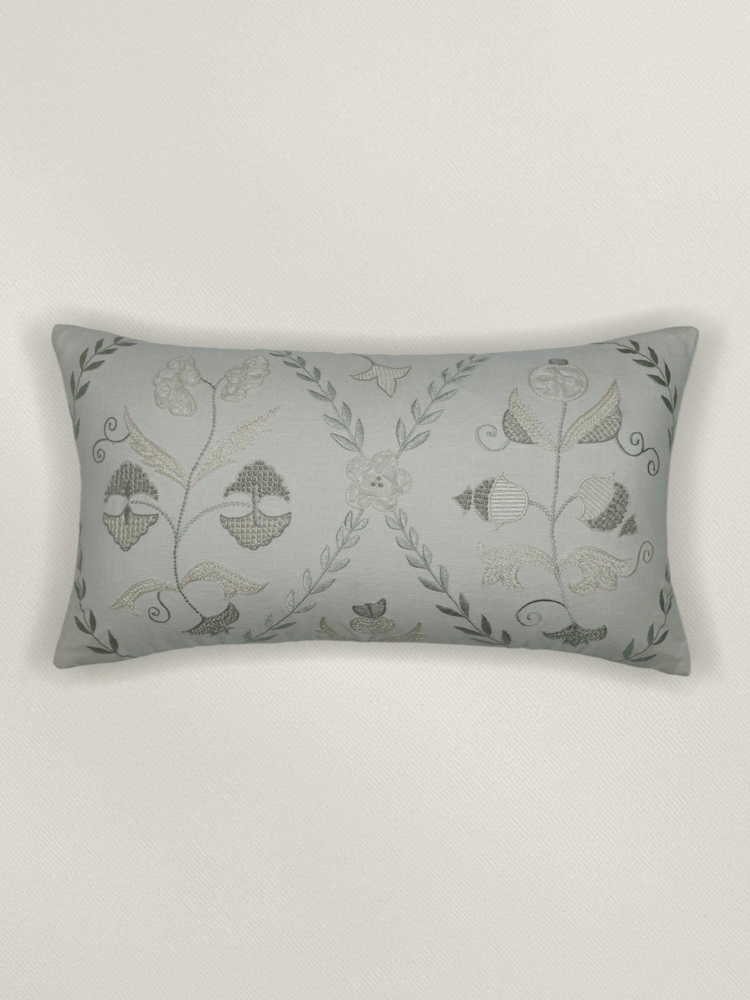 This elegant off-white polycotton cushion cover features intricate floral embroidery. The delicately stitched pattern of vines and blooms, rendered in soft shades of grey, silver, and sage green, adds subtle texture and charm while maintaining a refined aesthetic. Crafted from a smooth, durable polycotton blend, the cushion offers both comfort and easy maintenance, making it a perfect accent piece for sofas, beds, or lounge chairs. The size of this cushion cover is 12 x 22 inches, along with an invisible zip at the back that ensures easy insertion and removal while maintaining the overall look.