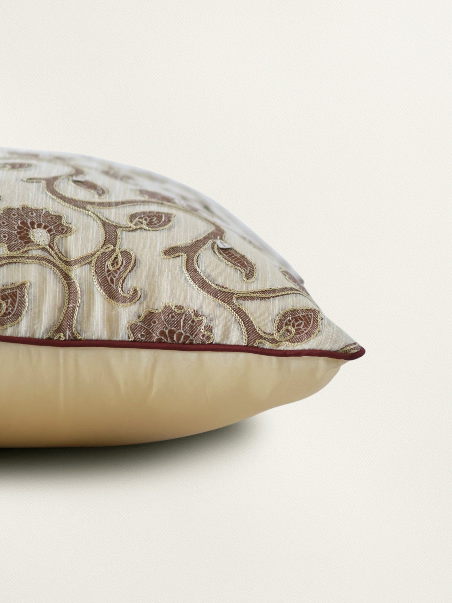 This festive season, elevate your home with our Hand Embroidered Cushion Cover. It features intricate hand embroidery in cream and maroon shades. The design showcases patterns that highlight the artwork. The cushion cover is designed with cord piping along the edges, which gives the cushion a neat, structured finish, that enhances the overall look of the cushion cover. The size of the cushion cover is 18x18 inches, set of 1. The zip closure at the back ensures easy insert and removal. A perfect decor piece for your home on this festive season.