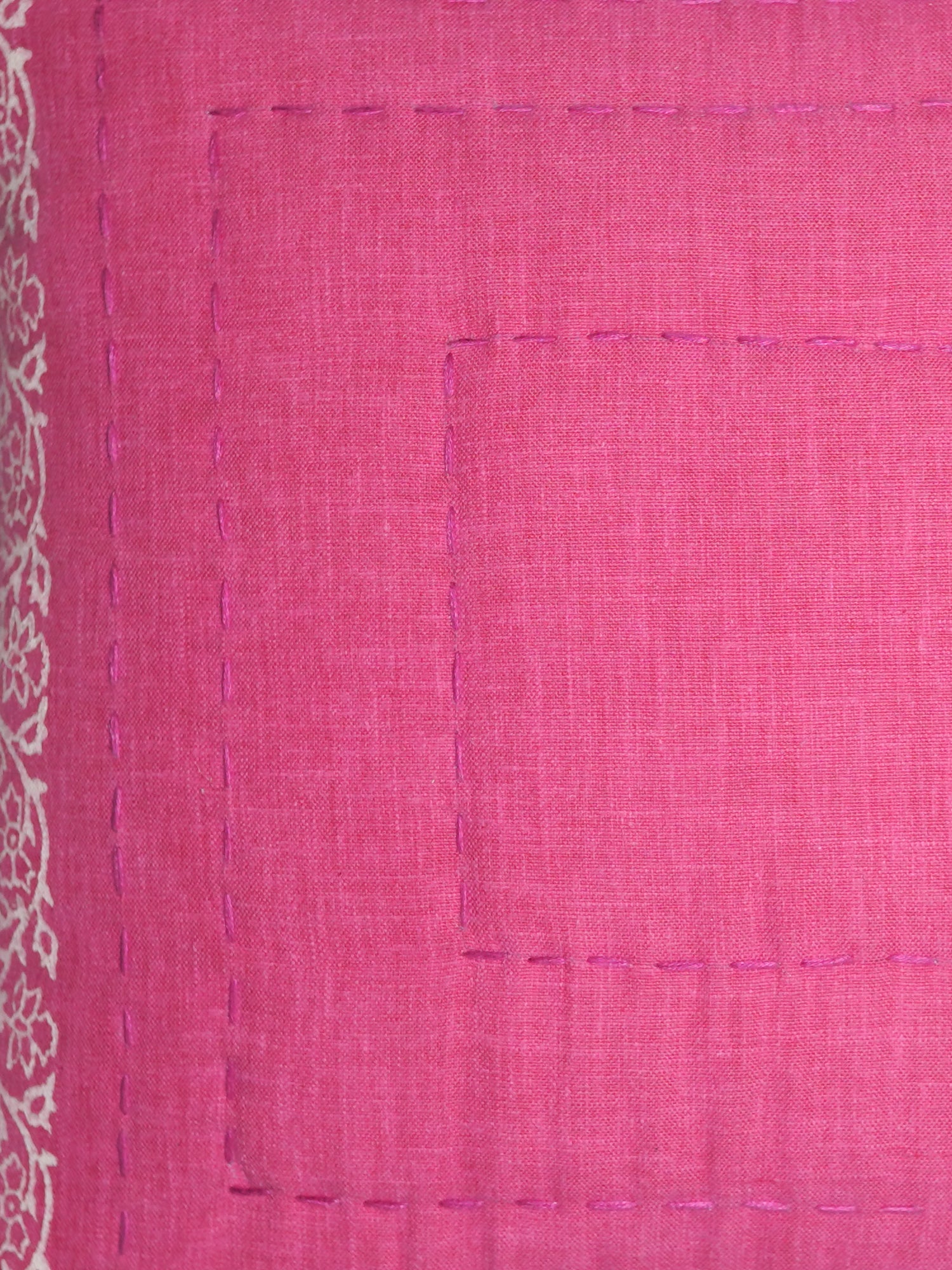 The 16×16 inch size provides a perfect fit for your sofa or bed, while the stunning block print design adds a touch of timeless artistry. Intricate hand embroidery in a vibrant coral hue further enhances the piece, creating a striking contrast that complements any décor.