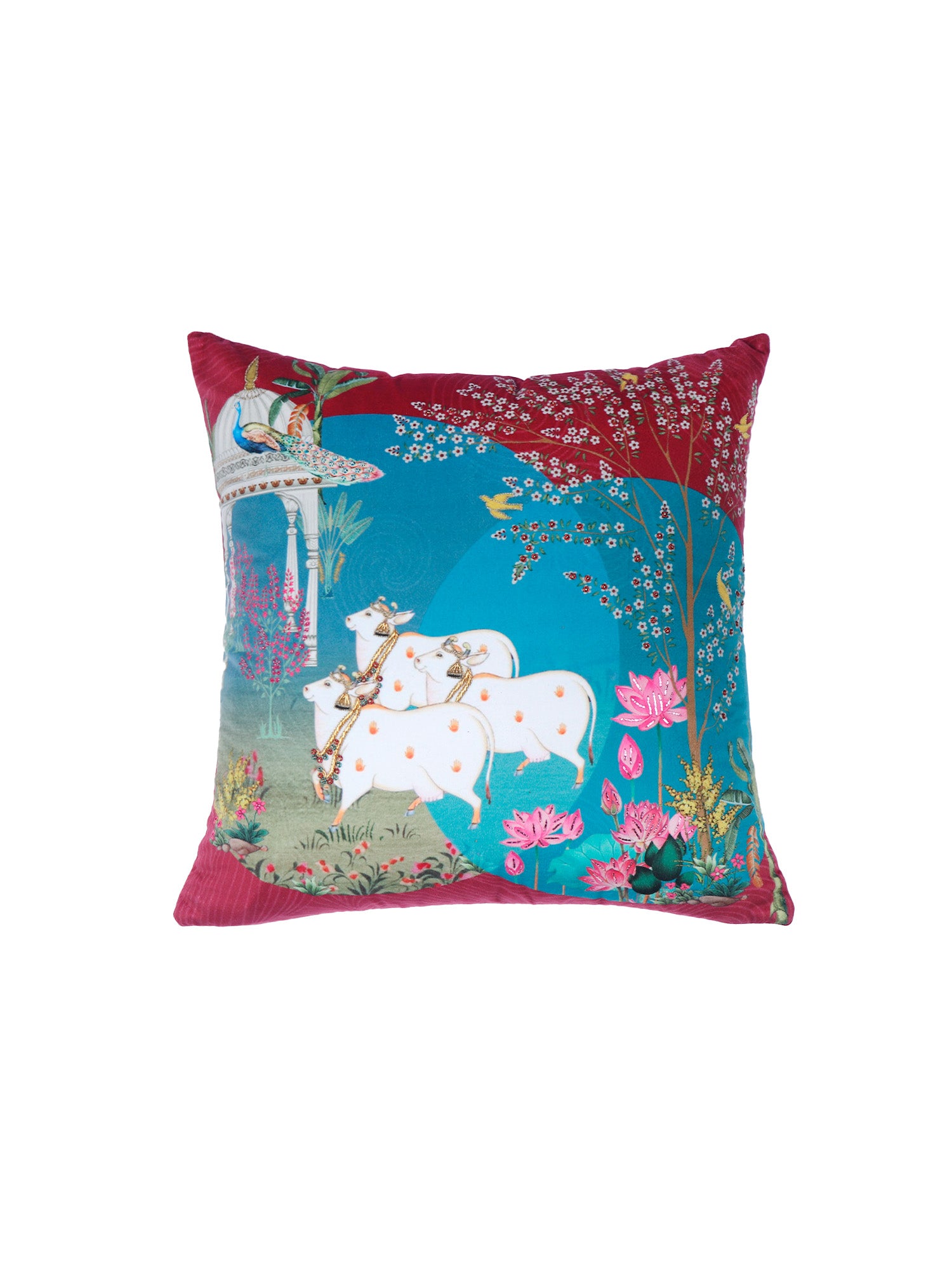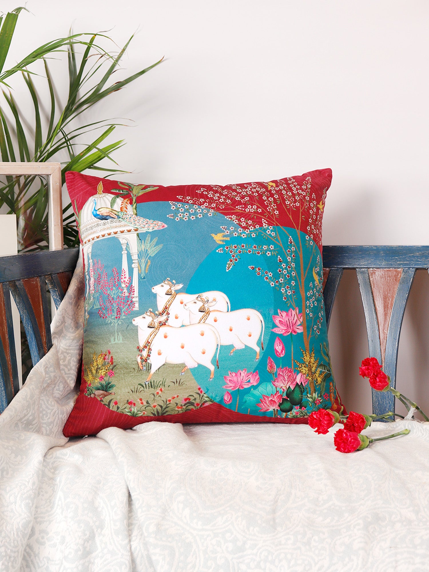 Hand Embroidered Pichwai Cushion Cover with Digital Print | Embellished Velvet 18x18 Inches