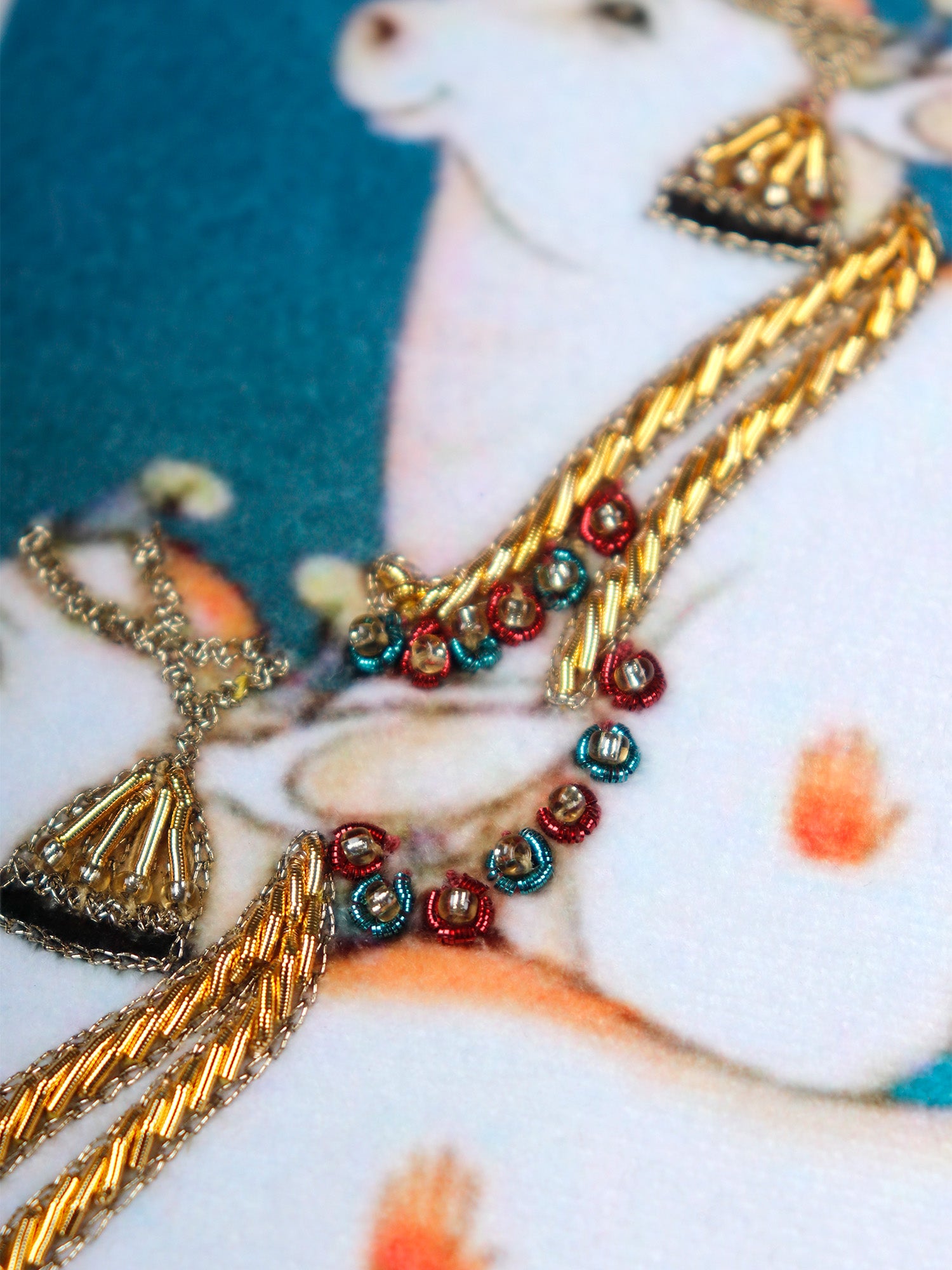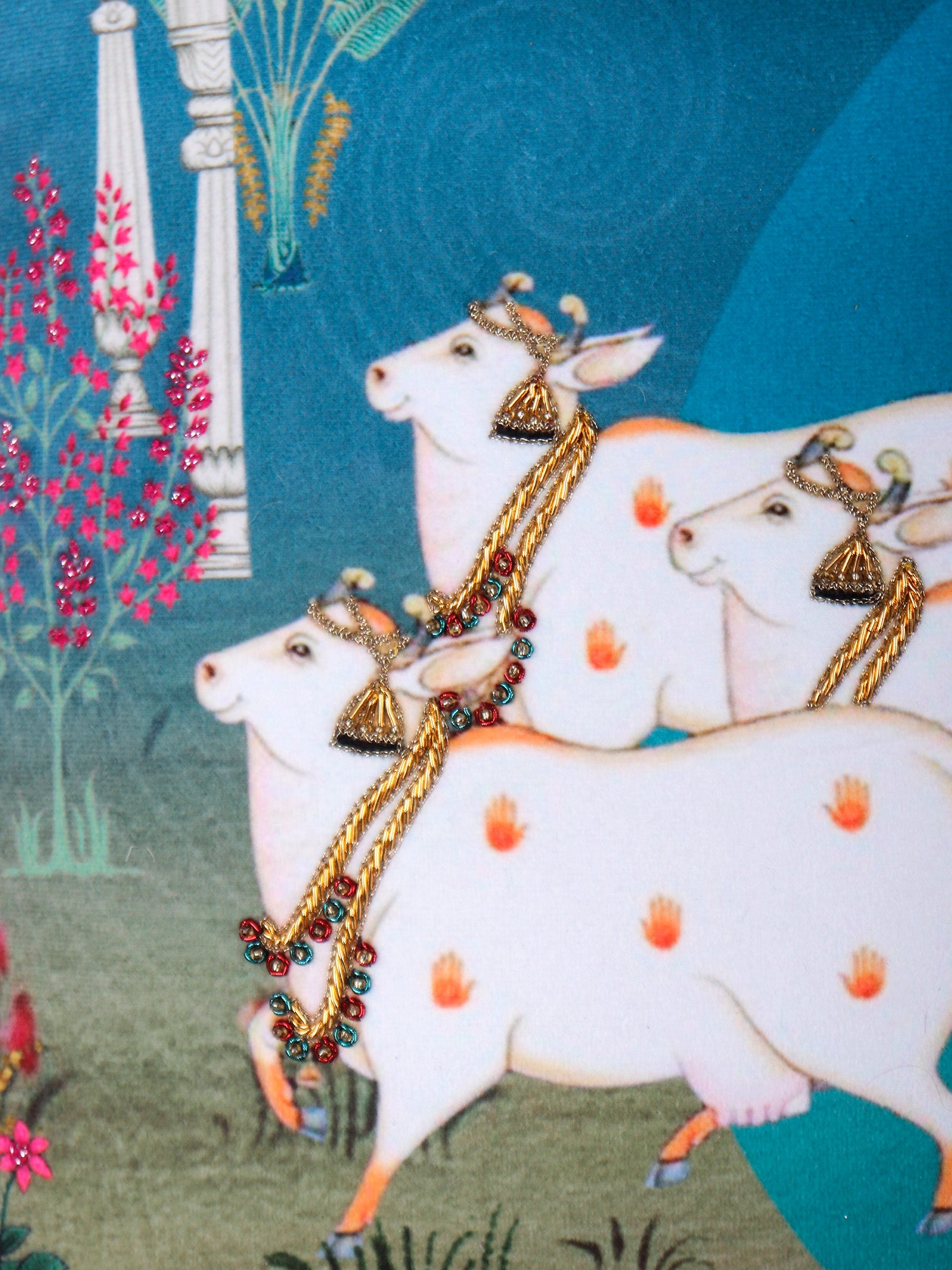 The design features an enchanting Pichwai-inspired digital print—a celebration of traditional Indian art—brought to life with intricate, multi-colored hand embroidery that adds a dimensional allure.