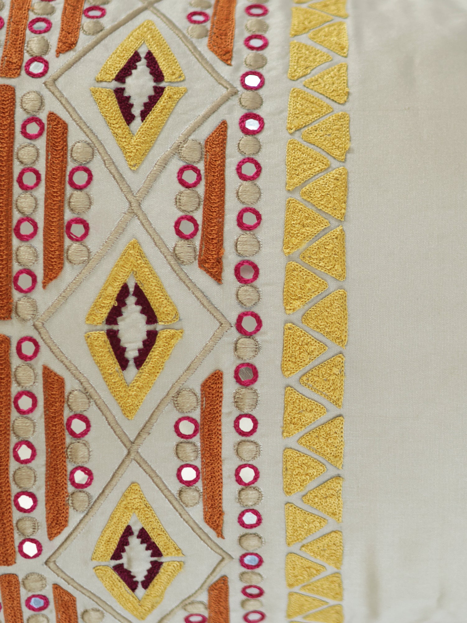 Zeba World Phulkari Collection cushion cover crafted from premium taffeta fabric (a crisp, luxurious fabric known for its elegant sheen, structure), features machine and hand embroidery that forms an intricate design in multicolor threads. The 12x20 inch lumbar format makes it a versatile choice for sofas, armchairs, or beds. A perfect designer piece for this festive season to brighten up your space.