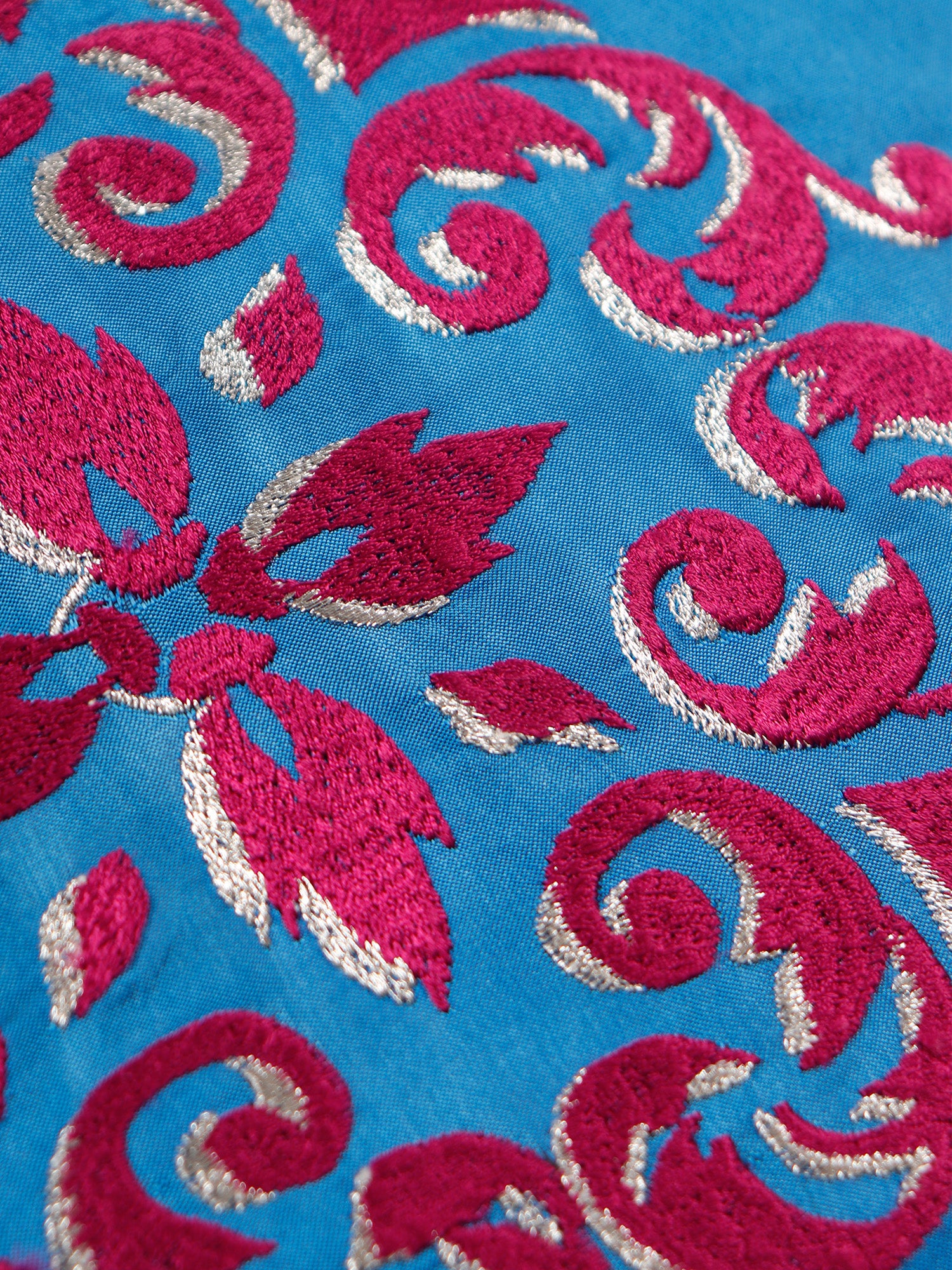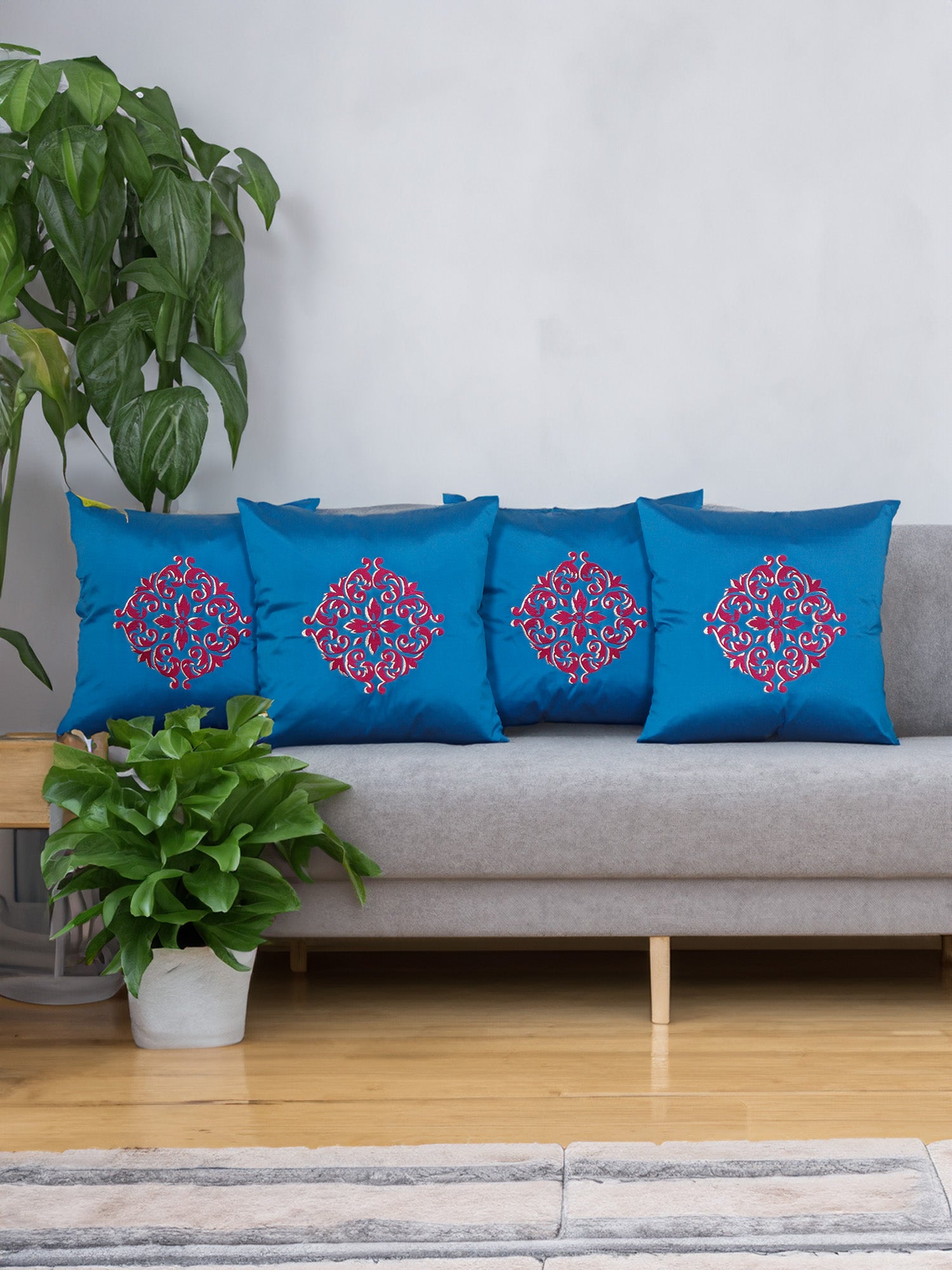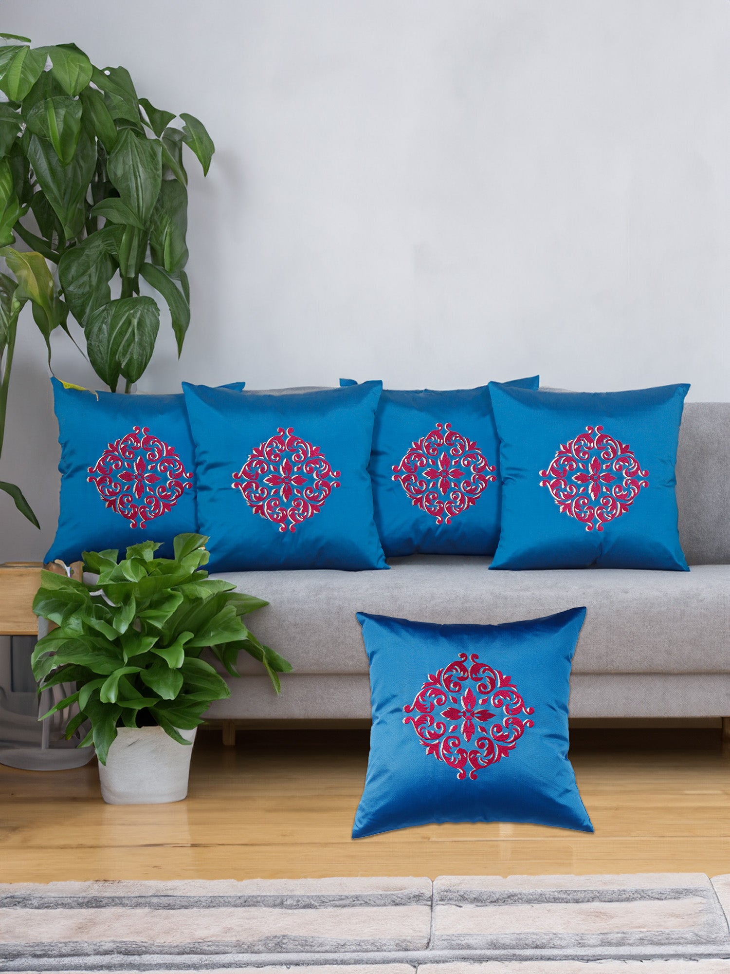 This 16 x 16 inch cushion cover from the house of Zeba is made from high-quality polyester fabric, offering a smooth and durable texture. The striking blue color forms the base, complemented by an intricate machine-embroidered design in two-tone colors—vibrant pink and subtle maroon—creating a visually appealing contrast. The embroidered motif in the center adds an elegant and refined touch, making this cushion cover a standout accessory for any modern or traditional interior setting.