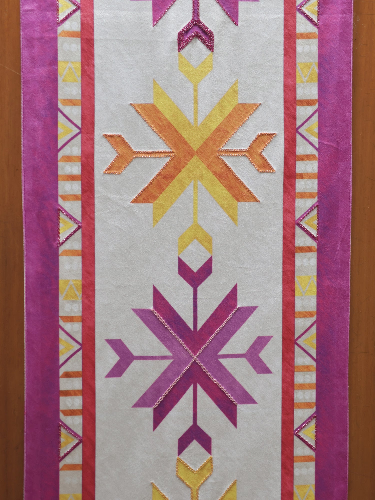 Dress your space with this beautifully crafted table runner, designed with Phulkari-inspired floral patterns in shades of pink, orange, and yellow. The embroidery work stands out against the soft polyester base, which instantly uplifts your dining setup. Size of the table runner is 12 inch x 84 inches, perfect for both 4-seater and 6-seater dining tables. Durable and easy to maintain, this table runner transforms your table into a showcase of refined style and timeless elegance.