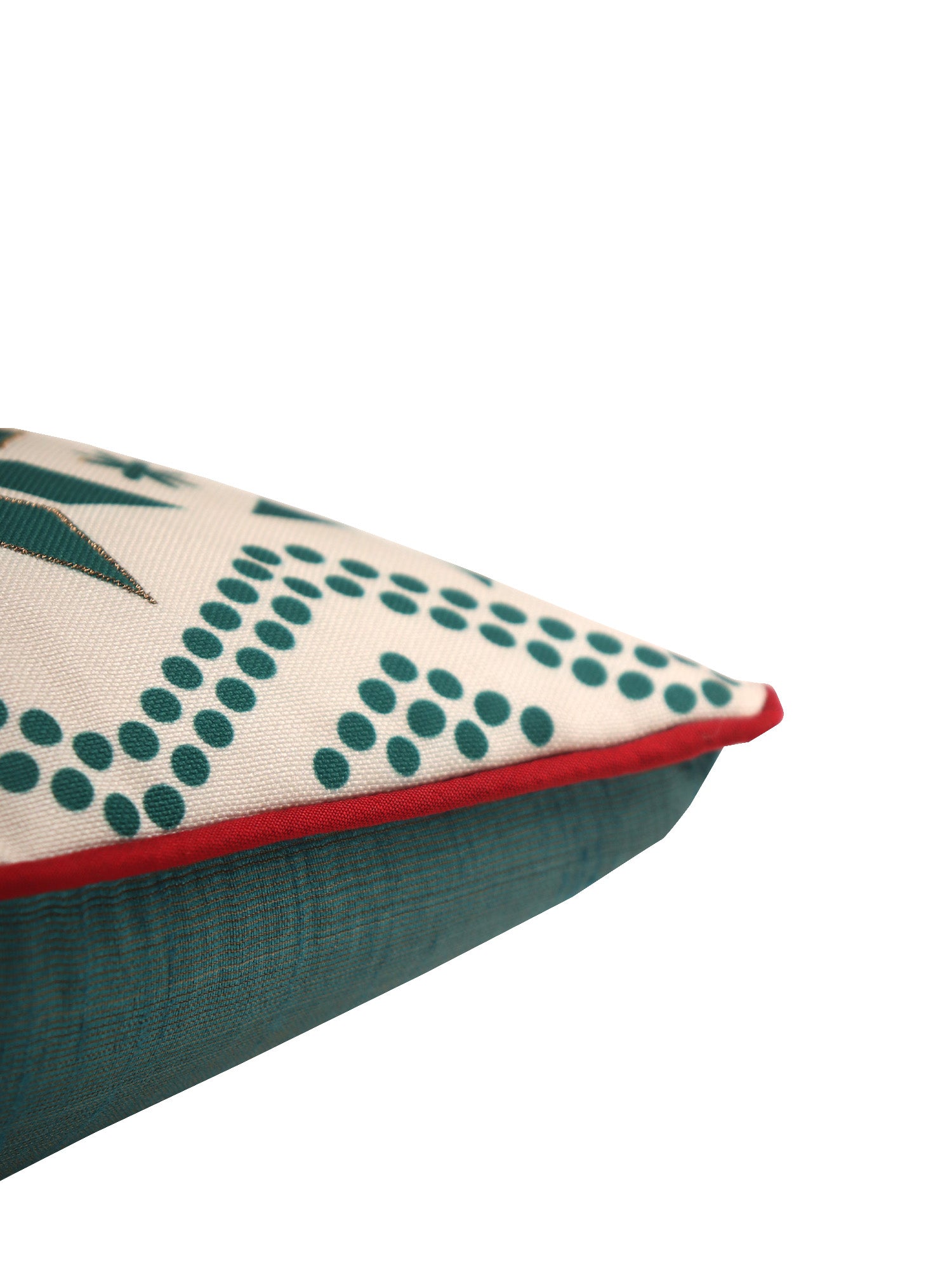 Printed Cushion Cover with Cord Piping and Antique Golden Zari Cotton Polyester Green - 16in x 16in
