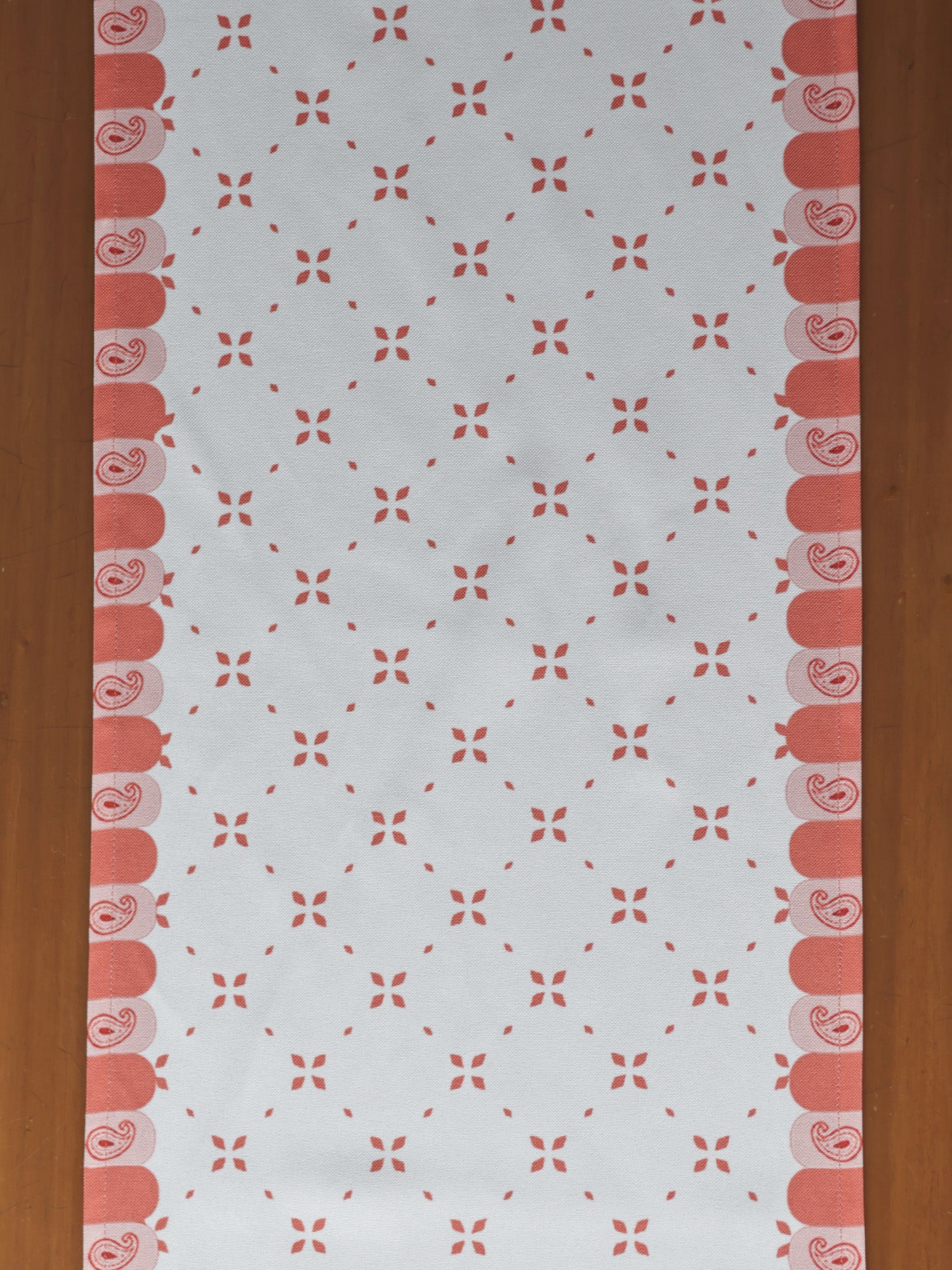 Infuse color and style into your dining area with this white & orange printed green table runner. The white base is printed in an orange hue with paisley design detailing at the edge. The fine hemming stitch is used to finish the raw edge of fabric by folding it and securing it in place, giving the runner a neat, clean look. Made from high-quality polycotton, it's durable and sturdy. The colorfully hand made tassels dangled at the corner give a playful look to the table runner, while its 12x84 inch size makes it perfect for both 4-seater and 6-seater dining tables. Ideal for your festive setup or everyday use.