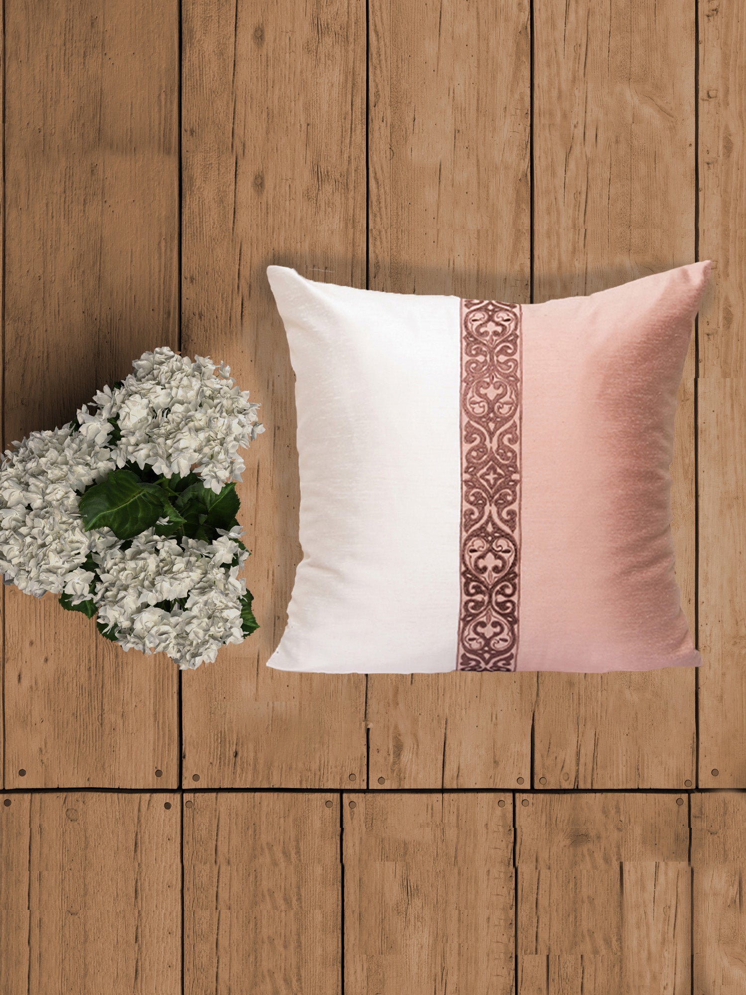 This cushion cover has patchwork in the centre with dark brown embroidery on it. The contrasting shade of brown stands out against the light rose pink and white colour giving it a simple and elegant look.