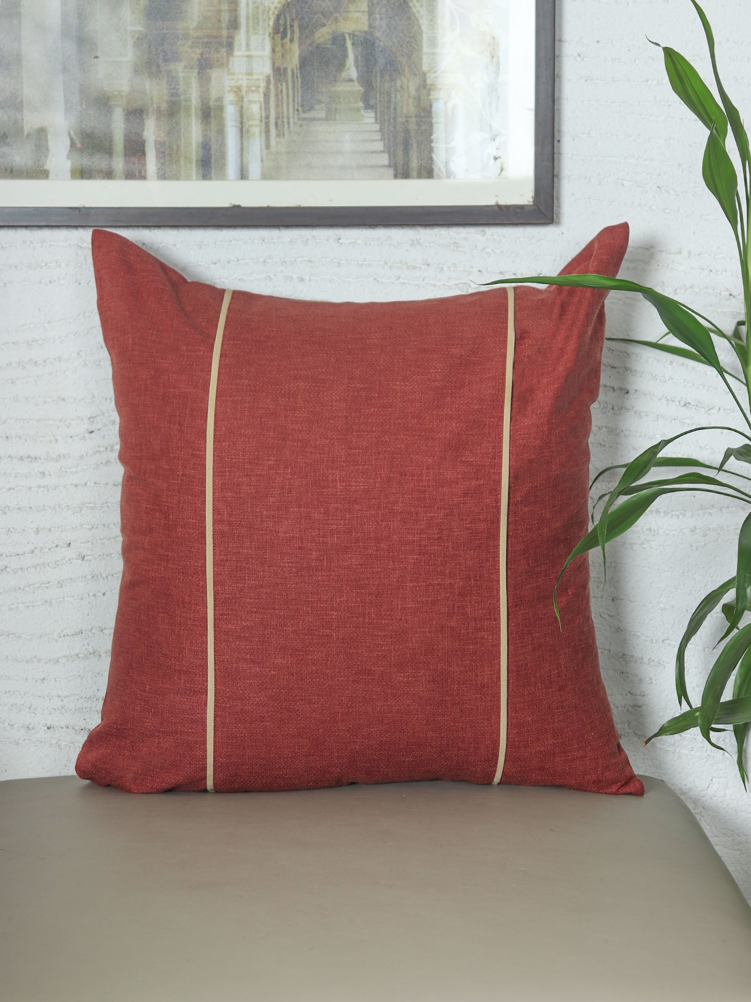 Elevate your home decor with our Cotton Blend Rust Cushion Cover, a tasteful and versatile addition to your living space. Crafted from a high-quality cotton blend fabric, it boasts a rich rust color that adds warmth and character to any room. The unique feature of this cover is the fig piping running through the center, offering an eye-catching and sophisticated detail. Designed to complement black, grey, or beige sofas, this cushion cover seamlessly marries style and compatibility, ensuring it's the perfect addition to refresh your interior design.