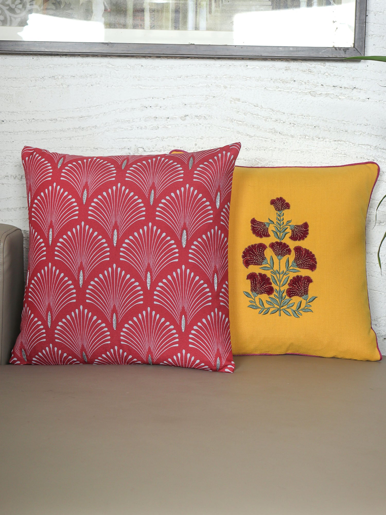 ZEBA World Square Cushion Cover for Sofa, Bed | Zari Hand Embroidery with Cord Piping - Poly Blend | Red/Yellow - 16x16in(40x40cm) (Pack of 2)